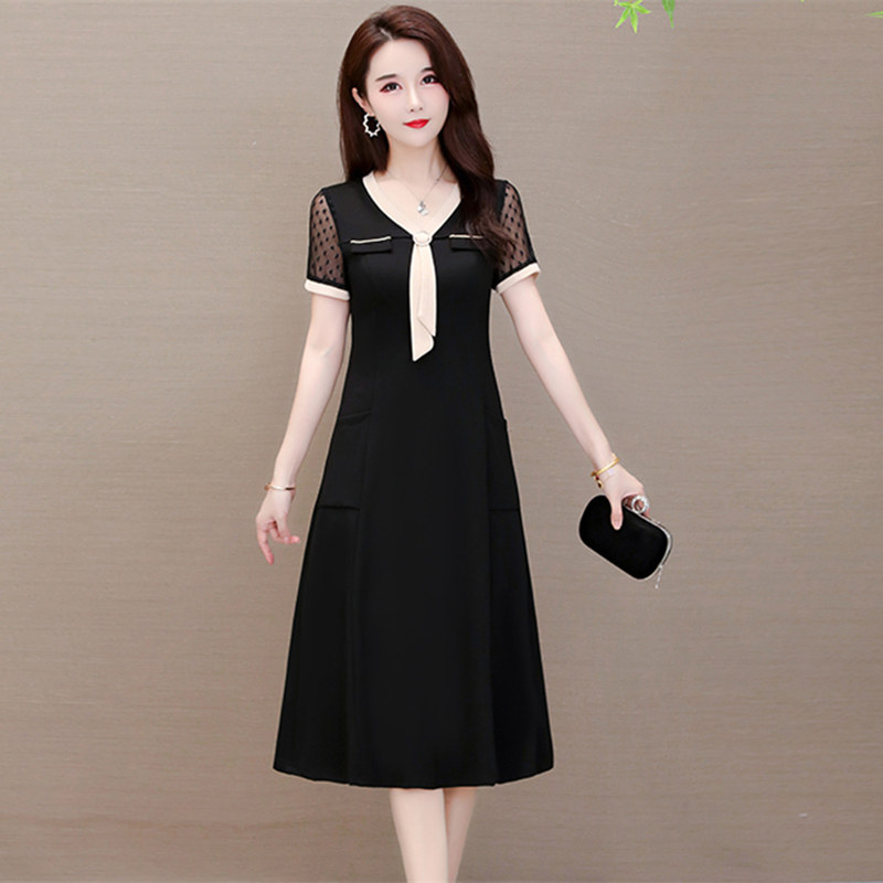 半袖の膝丈フレアシルエットは、エレガントさと動きやすさを両立しています。