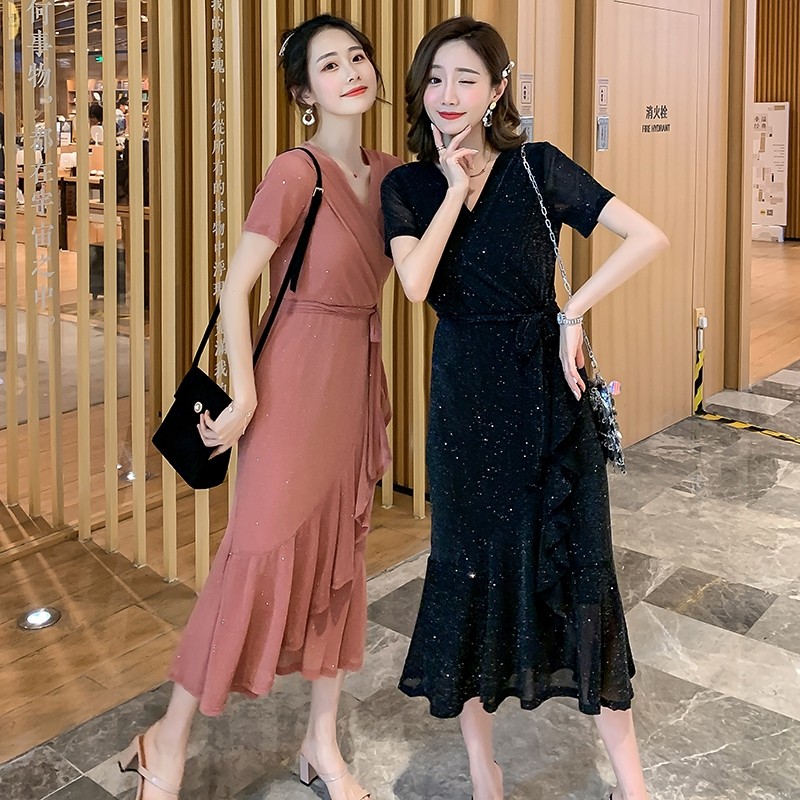 人気のお呼ばれドレスおすすめのラメ入りシフォン裾フリルで華やかな印象を与え周囲から褒められるミディ丈ワンピース