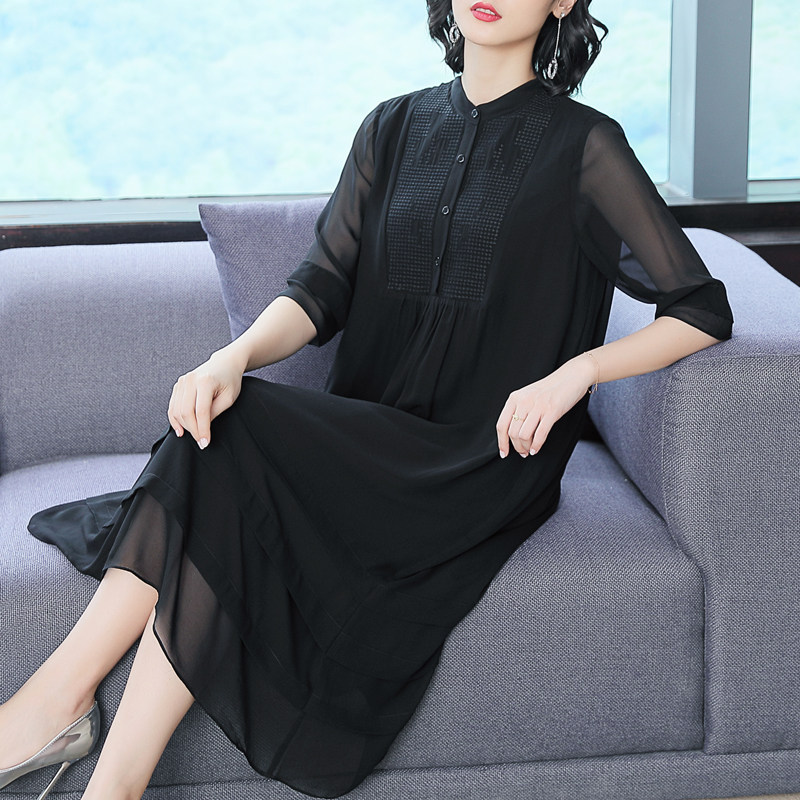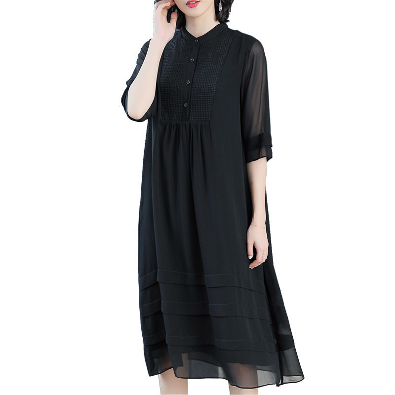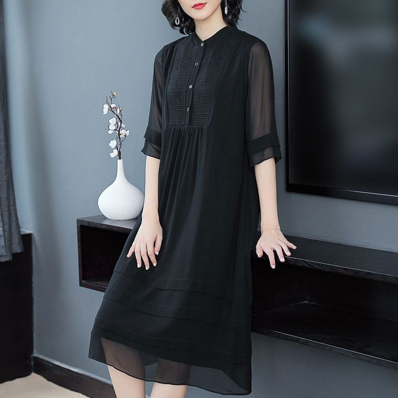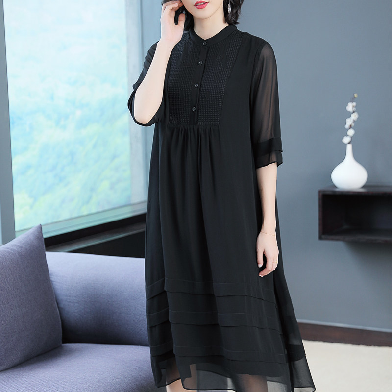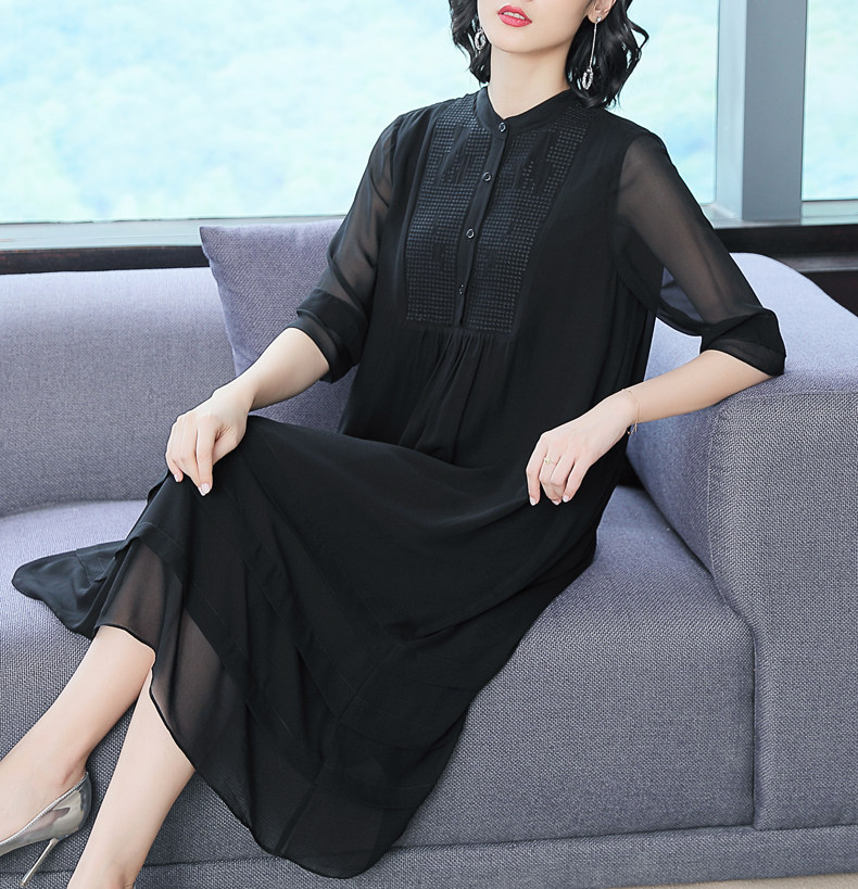 透け感のあるシフォン素材の袖が女性らしさを演出し、ゆったりとした身幅で体型をカバーしながらも洗練された印象に。