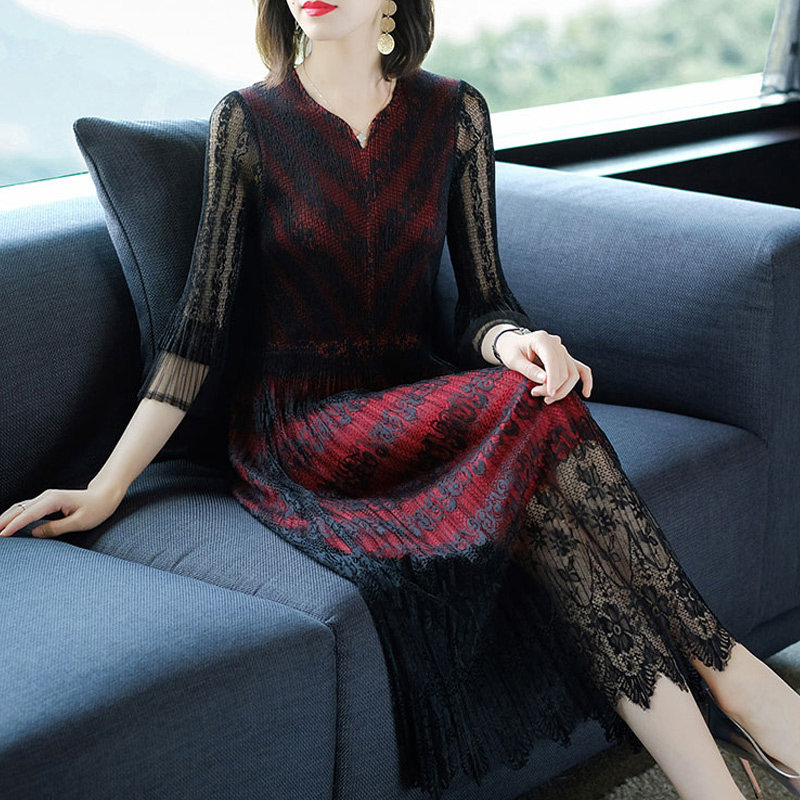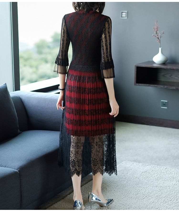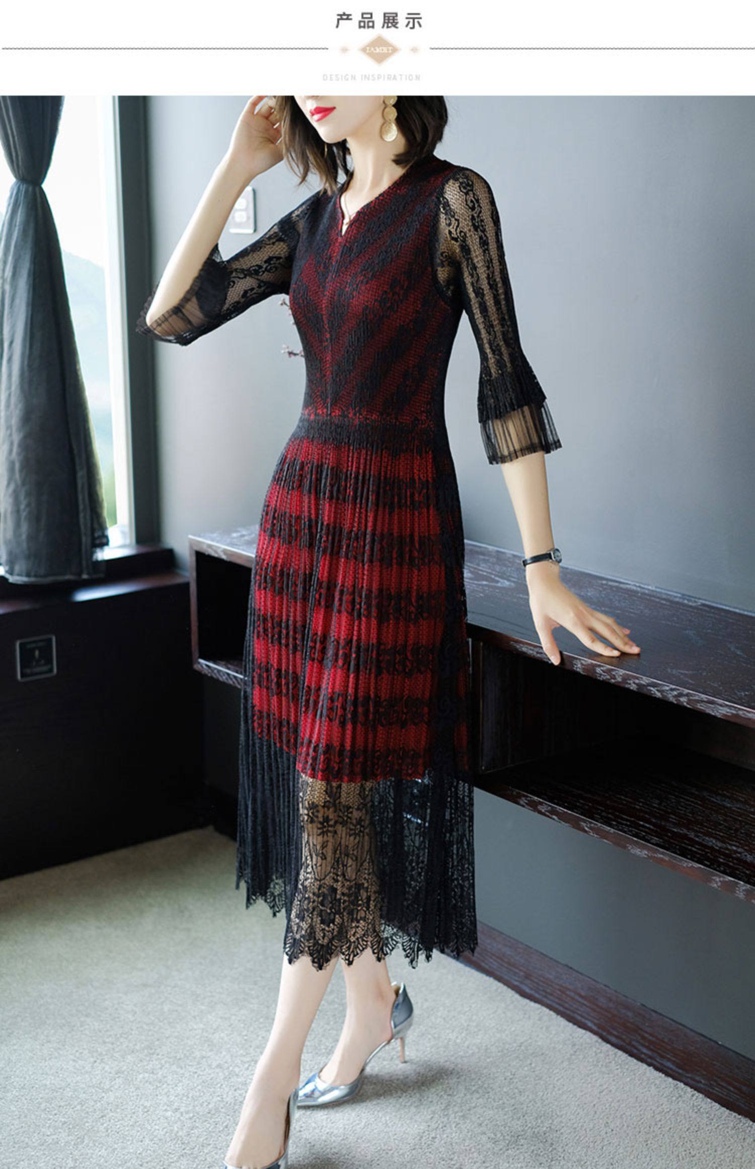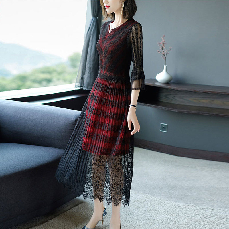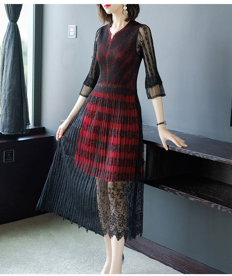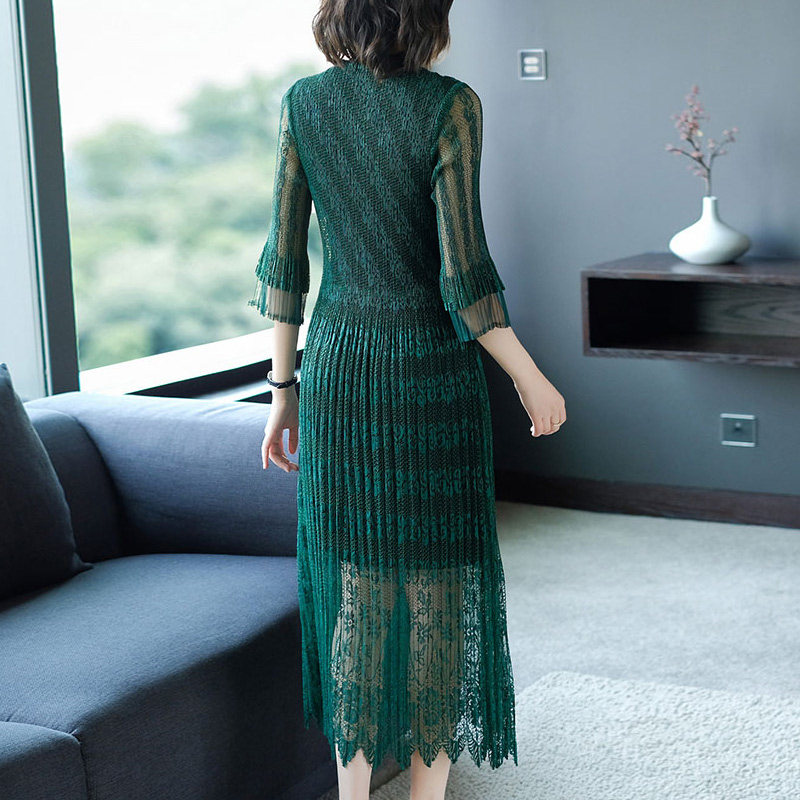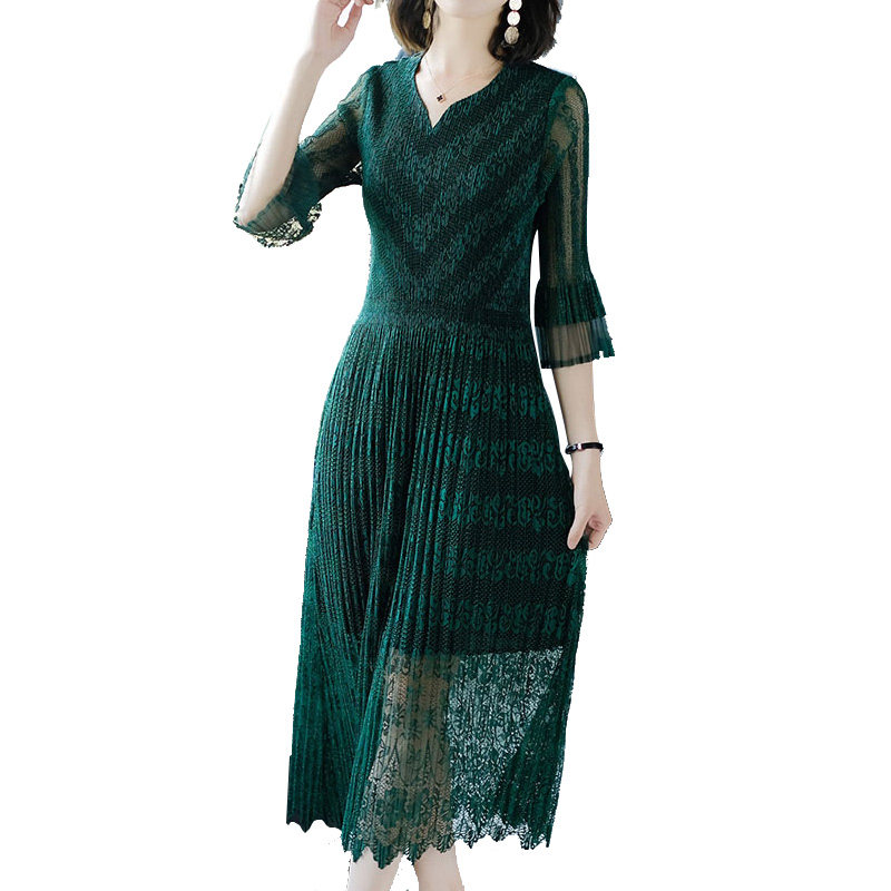 透け感のある七分袖と裾のプリーツ切替が上品な印象を与え、結婚式や二次会などの特別な日に最適なワンピースです。