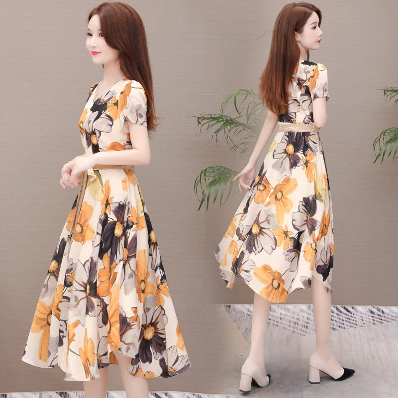 華やかな大輪の花柄が全体に散りばめられた、エレガントなパーティードレスです。