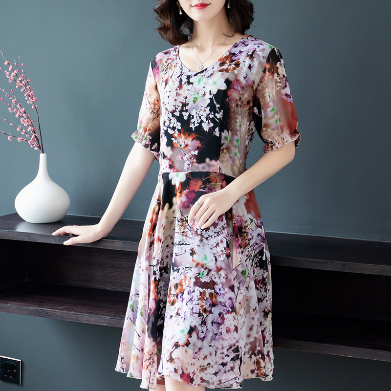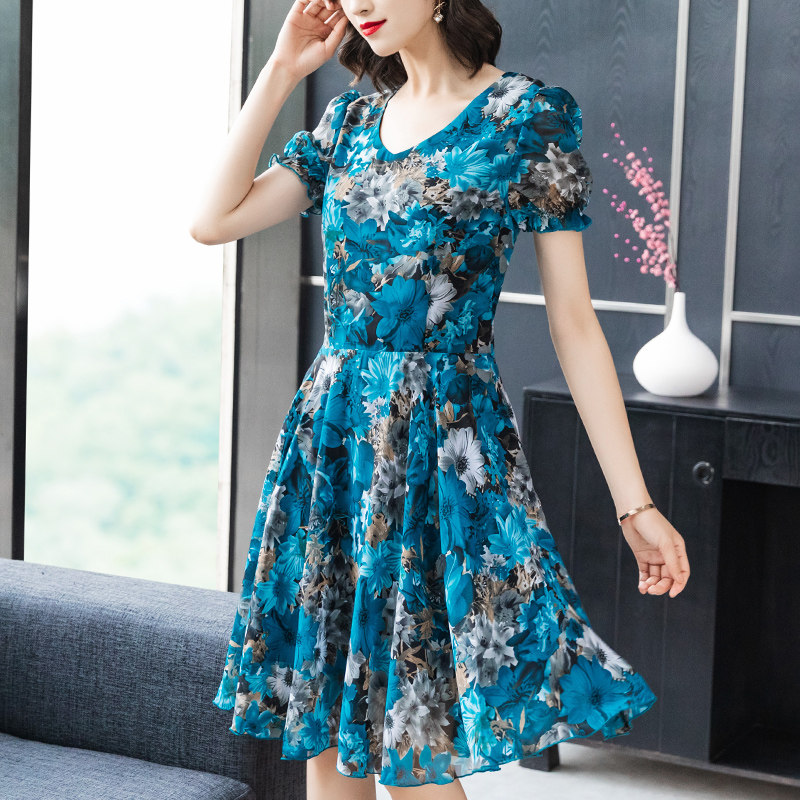 華やかな花柄プリントが美しいパーティードレスです。 軽やかなシフォン素材を使用したワンピースで、透け感のある五分袖が上品な印象を演出します。 ウエスト切り替えでスタイルアップ効果があり、ふんわりと広がるフレアスカートが女性らしいシルエットを作ります。 結婚式の二次会や食事会など、特別な日の装いにぴったりの一着です。