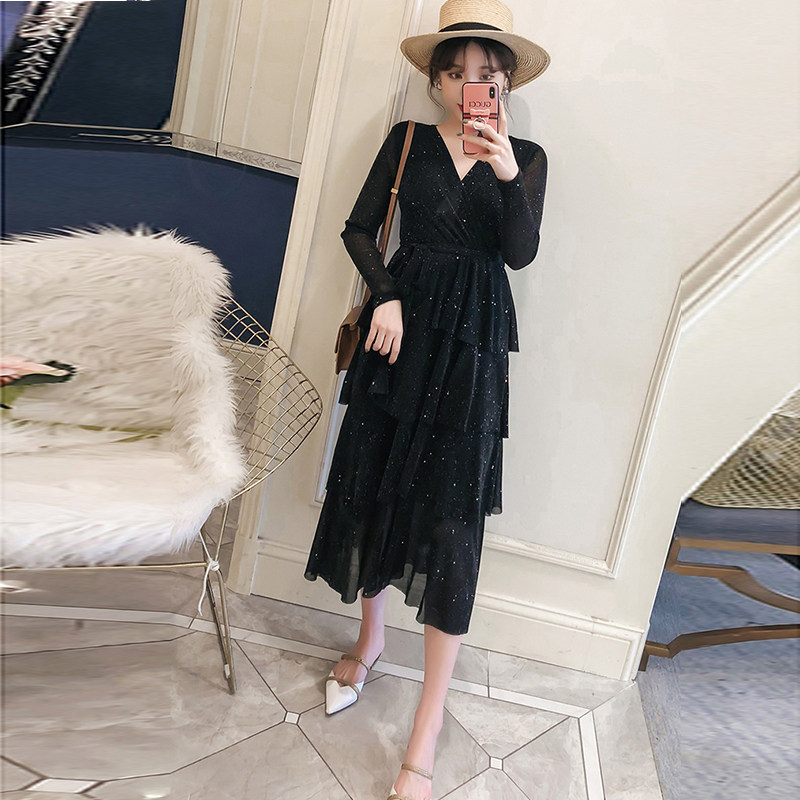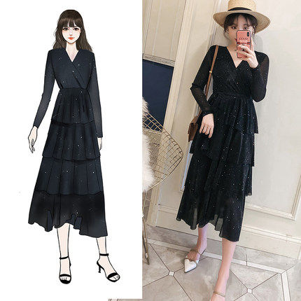 軽やかなシフォン素材を使用したワンピースで、揺れるたびに輝きを放ちます。