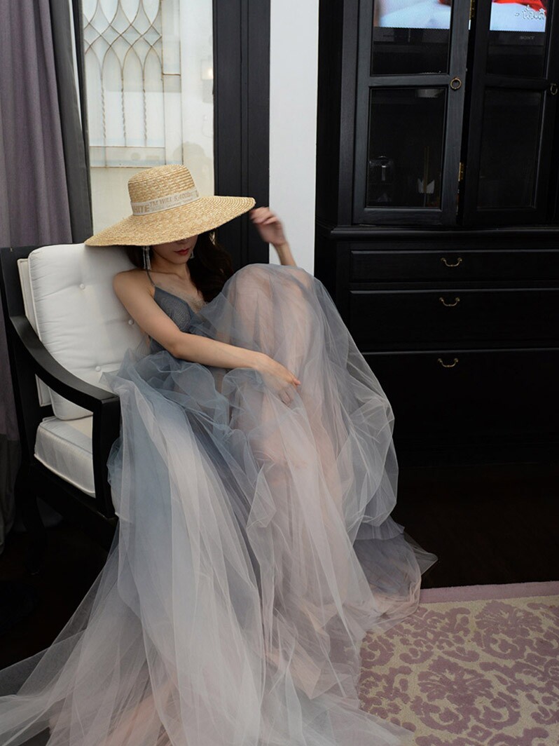 繊細なチュール素材を贅沢に重ねた、夢見るような美しいシルエットのワンピースです。 胸元のビスチェデザインと細いストラップが女性らしさを引き立て、ボリュームたっぷりのスカートが優雅に広がります。 透け感のある軽やかな素材が幻想的な雰囲気を演出し、結婚式やお呼ばれなどのパーティードレスとして最適です。 特別な日を華やかに彩る上品な一着です。