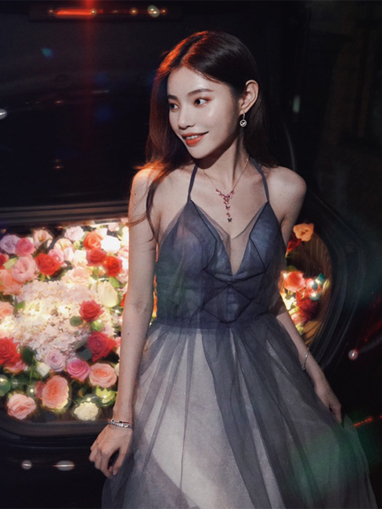 透け感のある軽やかな素材が幻想的な雰囲気を演出し、結婚式やお呼ばれなどのパーティードレスとして最適です。
