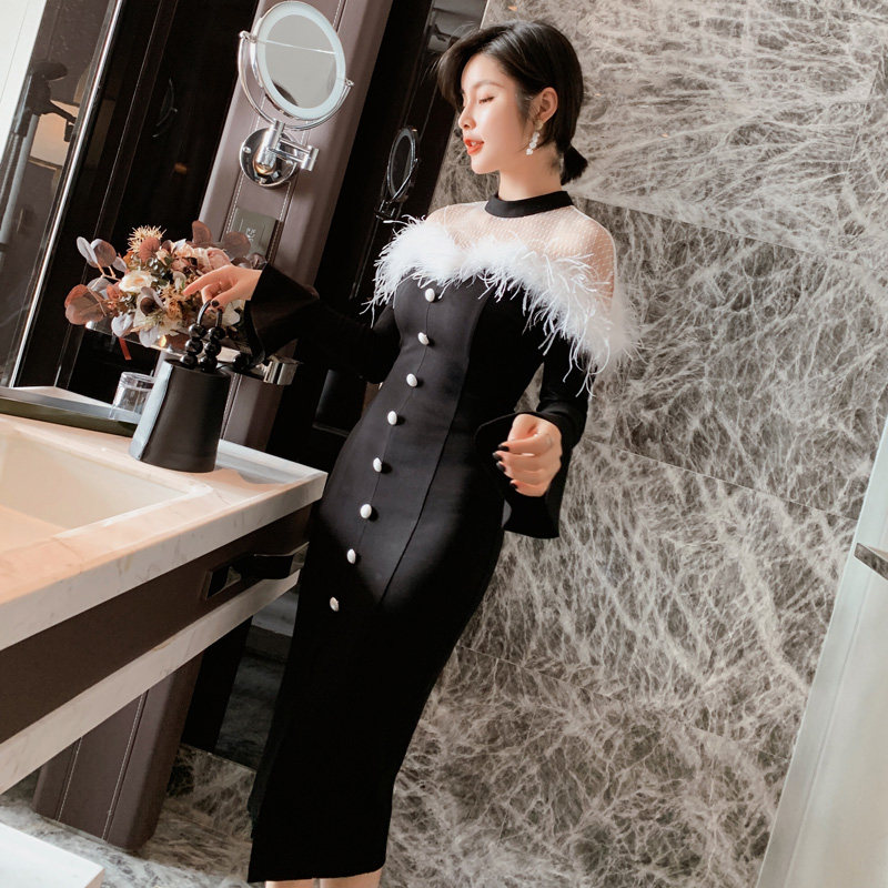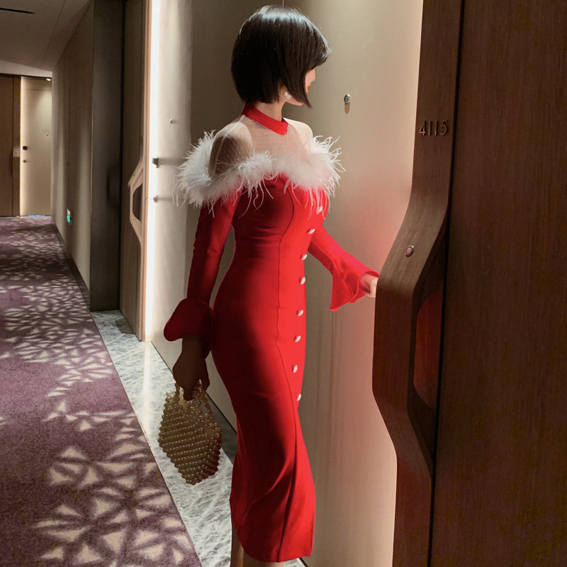 胸元のメッシュ切替とふわふわのファー装飾が華やかさを演出するパーティードレスです。