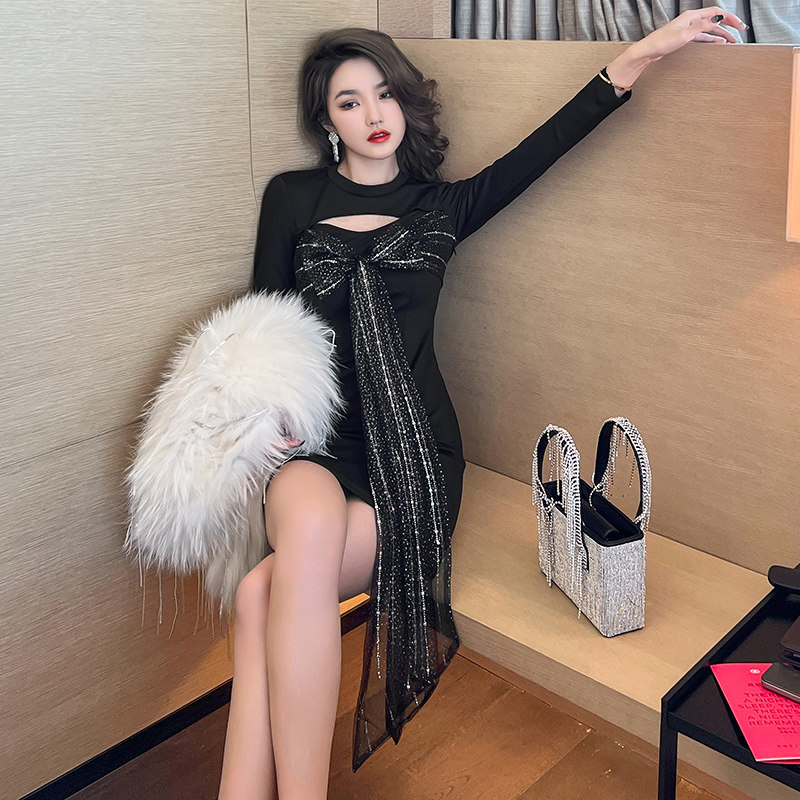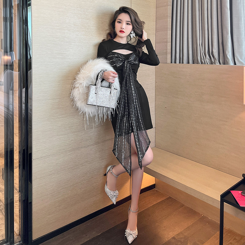 胸元の個性的なカットアウトデザインと大きなリボンモチーフが目を引くワンピースで、きらめく素材が特別な日を演出します。