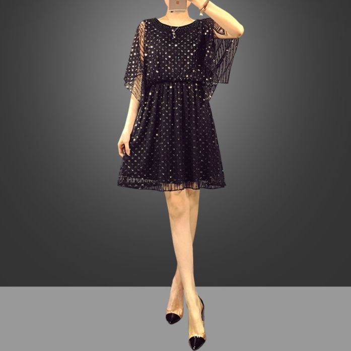 全体に施されたスパンコール刺繍が華やかな印象を与えるパーティードレスです。 透け感のあるシフォン素材の袖部分は二の腕をカバーしながら上品な雰囲気を演出します。 ウエスト部分のギャザーが自然な立体感を生み出し、女性らしいシルエットを実現します。 結婚式や二次会などの特別な日にぴったりのワンピースです。 裾のプリーツデザインが動くたびに優雅に揺れ、華やかさを一層引き立てます。