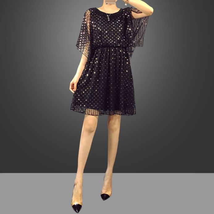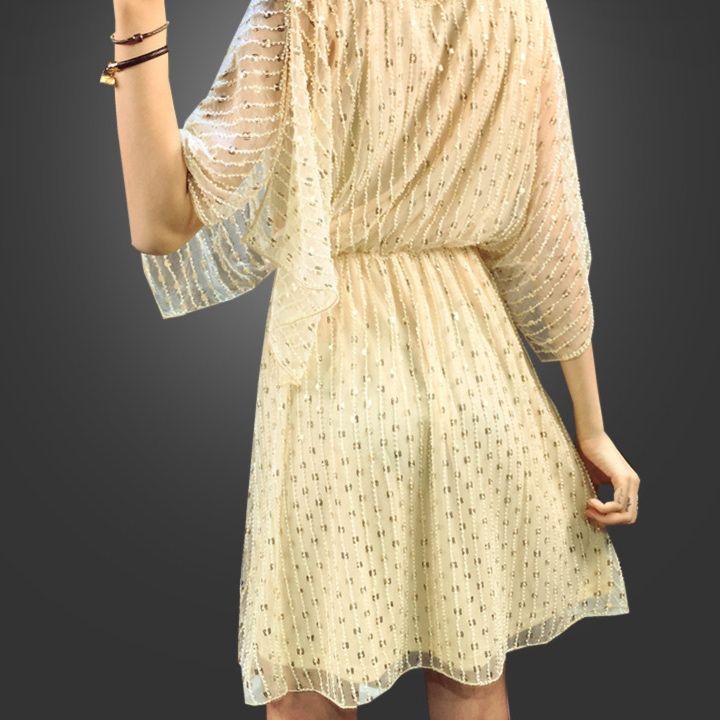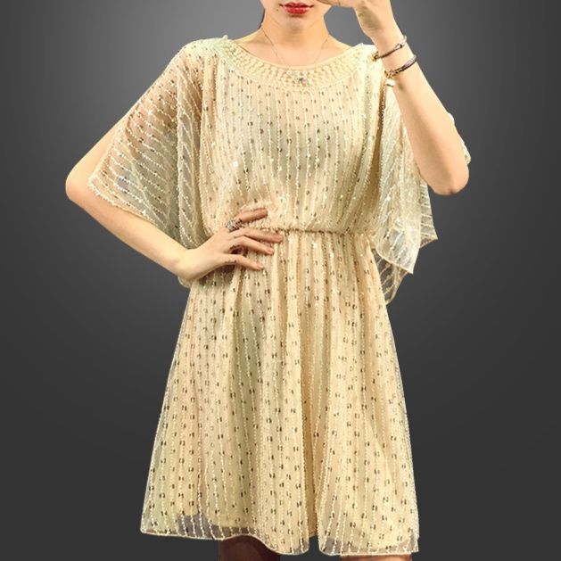 全体に施されたスパンコール刺繍が華やかな印象を与えるパーティードレスです。