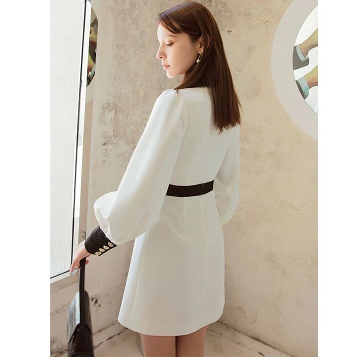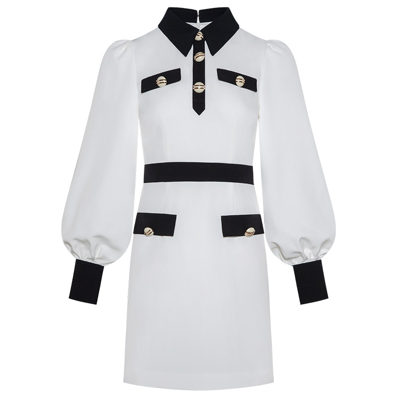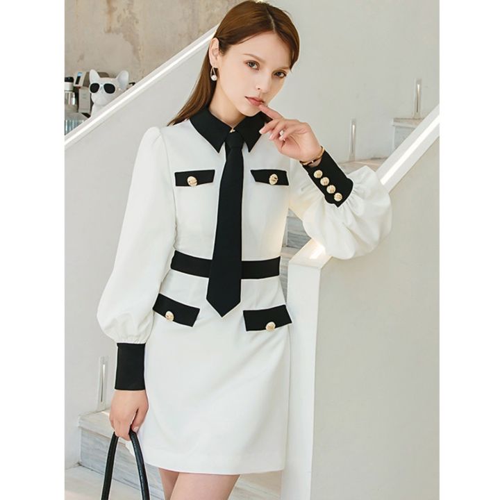 襟元のリボンタイが上品な印象を与えるパーティードレスです。 胸元と袖口の配色デザインがアクセントになり、きちんと感を演出します。 ボタンのゴールド装飾がエレガントな雰囲気を高めています。 すっきりとしたシルエットのワンピースで、結婚式やお呼ばれなど様々なシーンで活躍します。 袖はふんわりとしたボリューム感があり女性らしさを引き立てます。