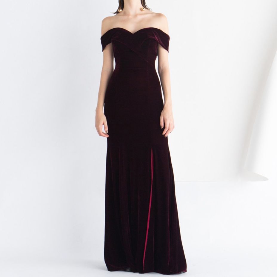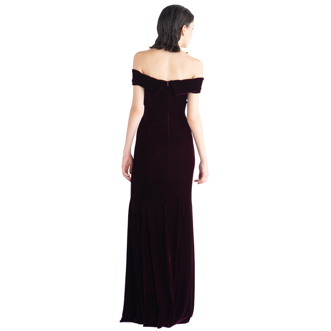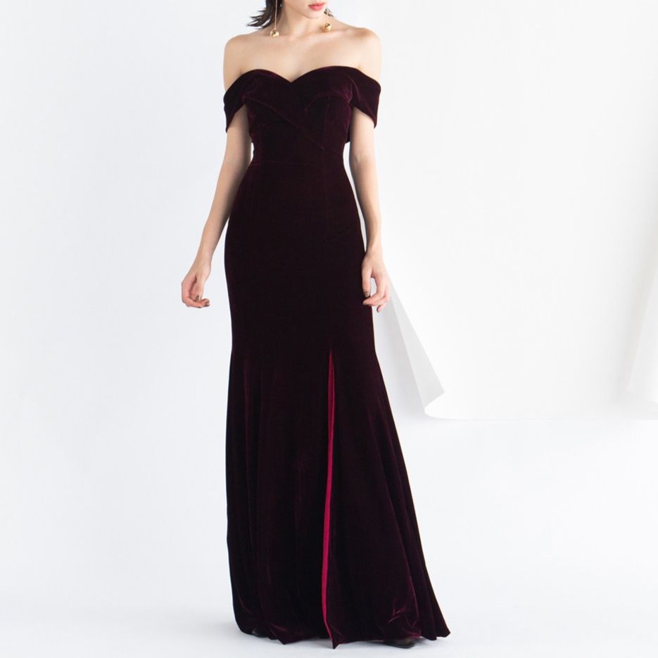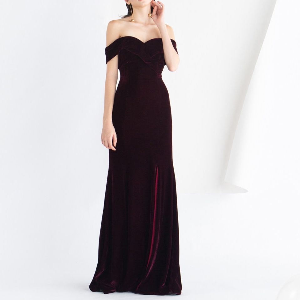 華やかなオフショルダーデザインが肩のラインを美しく見せるパーティードレスです。 上質なベルベット素材を使用し、高級感と落ち着いた雰囲気を演出します。 マーメイドラインのシルエットが体のラインを優雅に包み込み、裾に向かって広がるデザインが女性らしさを引き立てます。 結婚式や披露宴、特別な式典などフォーマルなシーンに最適なワンピースです。