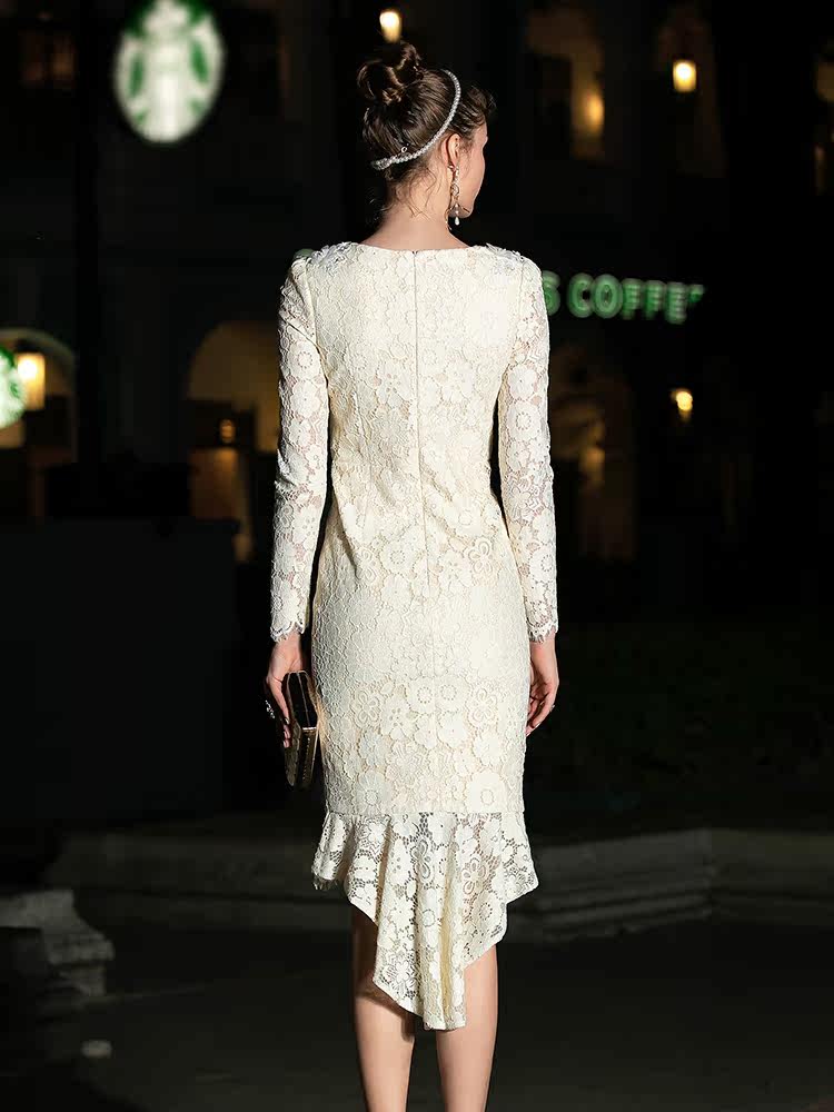 長袖デザインで品格を保ちながら、透け感のあるレースが女性らしさを演出します。