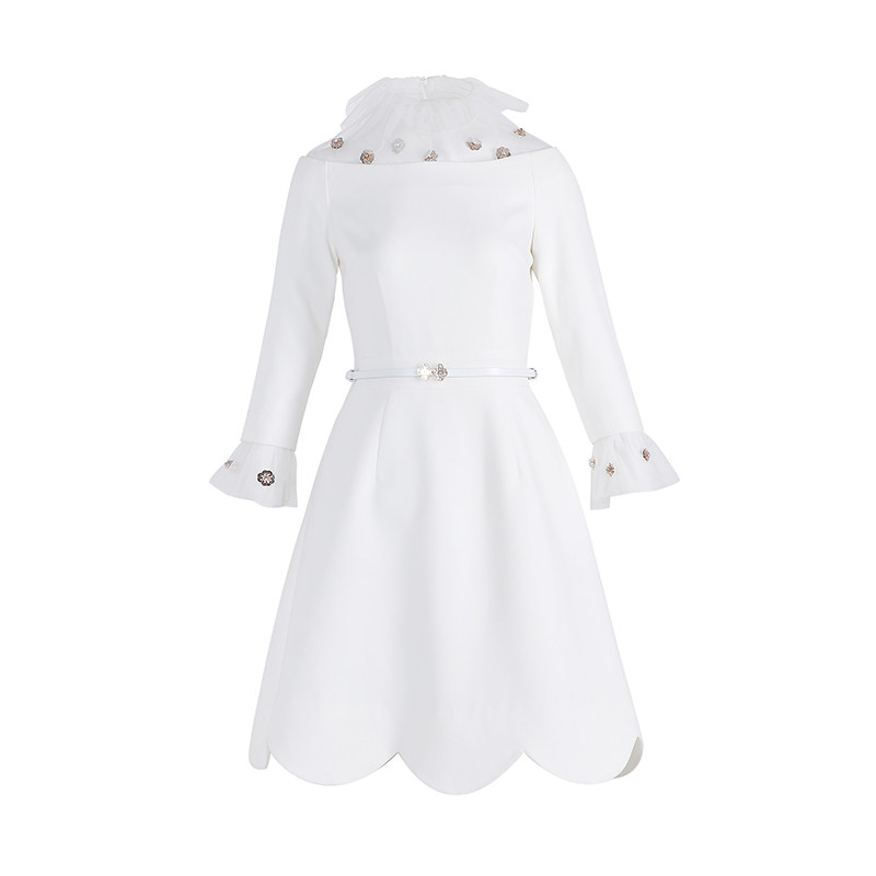 透け感のあるチュール素材の襟元にビジューをあしらい、エレガントな印象を演出します。
