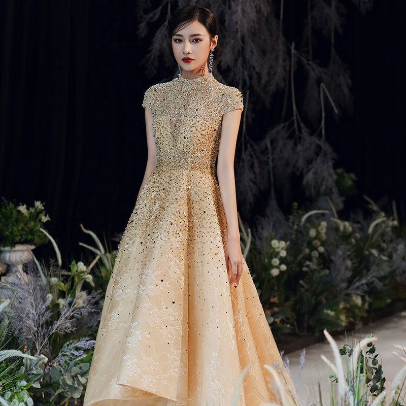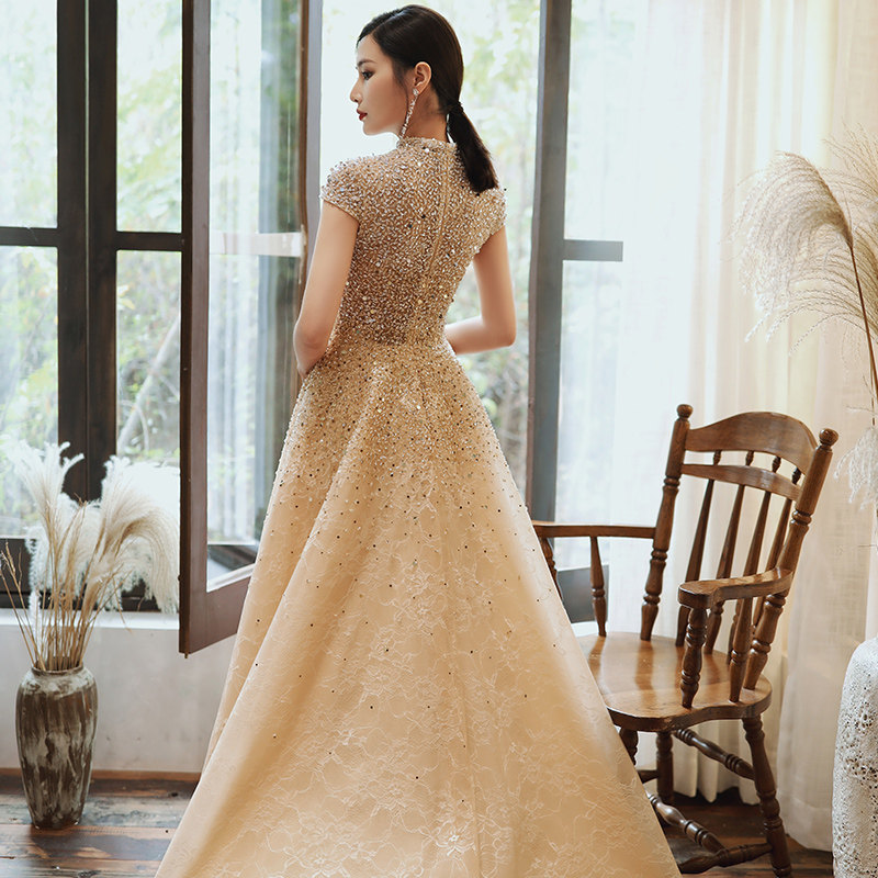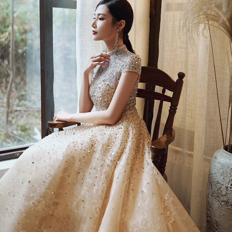 立体的なハイネックデザインと繊細なビーズ装飾が高級感を演出します。