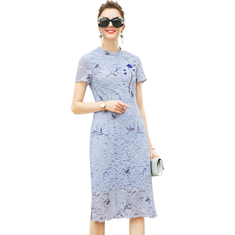チャイナ風の立ち襟と半袖のデザインが女性らしさを引き立て、膝丈の上品な着丈で様々なシーンに対応できます。