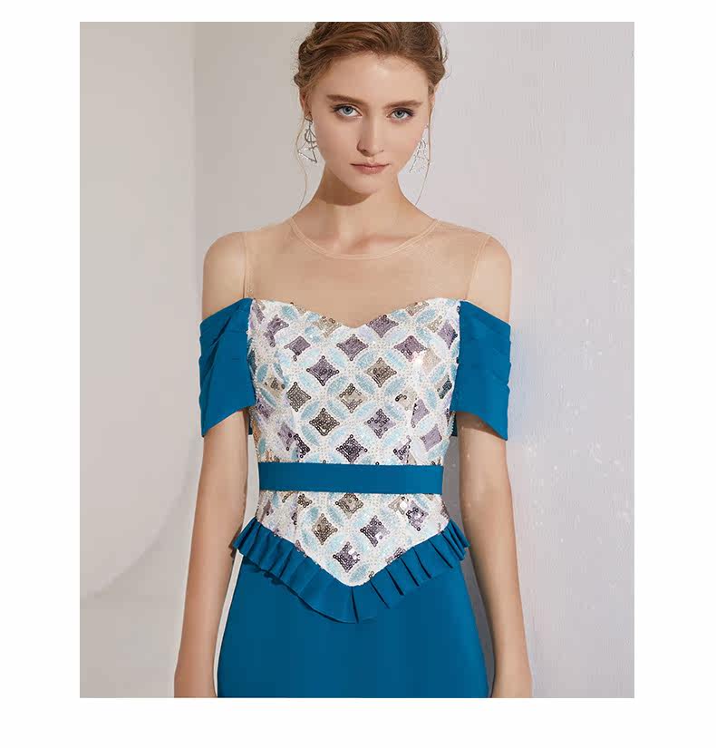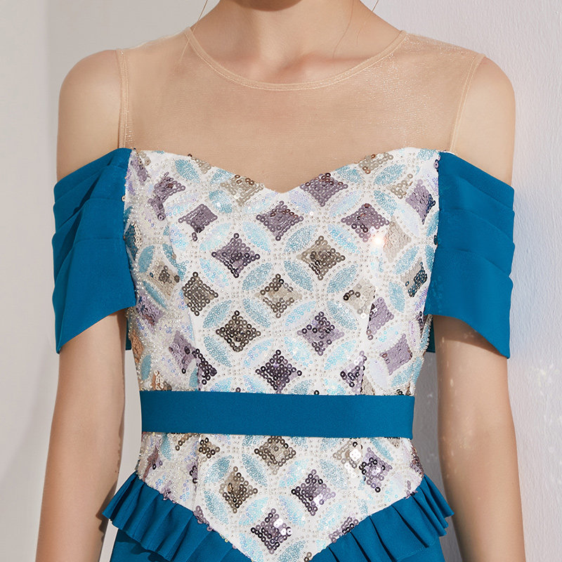 オフショルダーのデザインが女性らしいデコルテラインを美しく演出し、ウエストのフリルディテールがアクセントになっています。