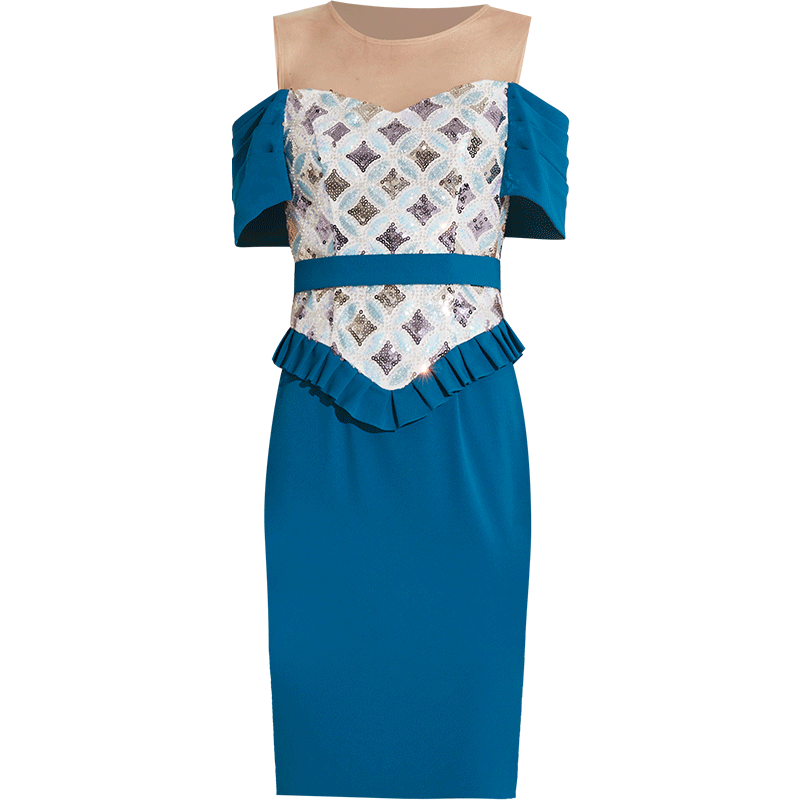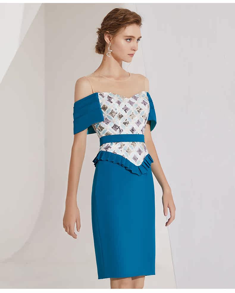 華やかな幾何学模様のビジューが輝く上品なパーティードレスです。