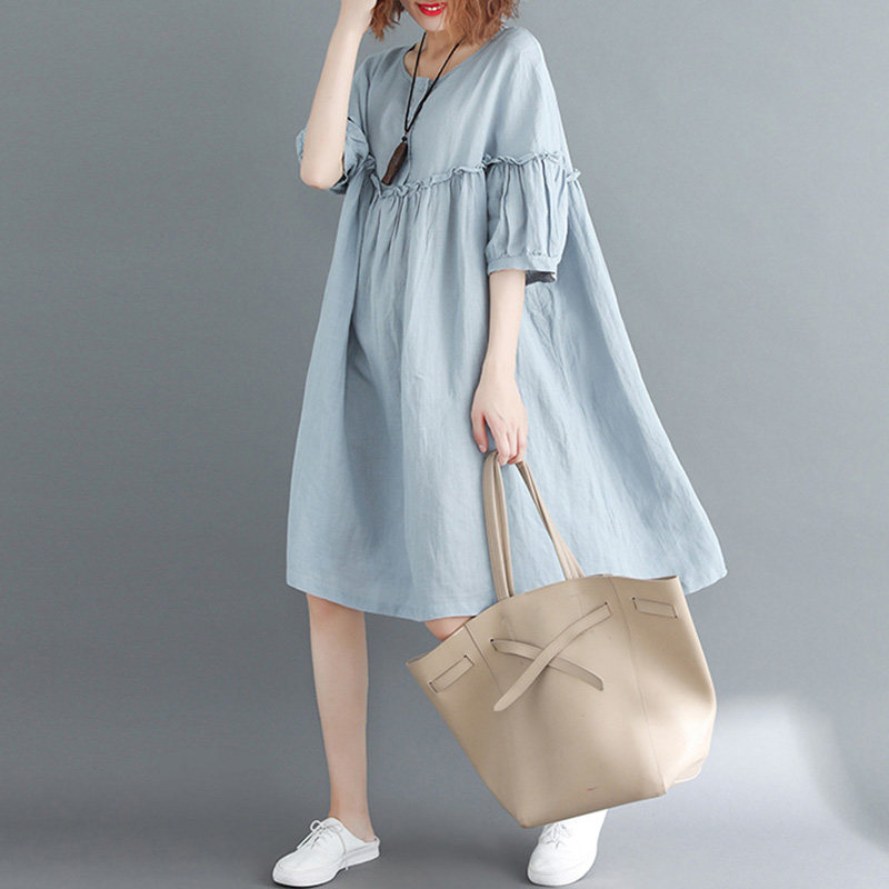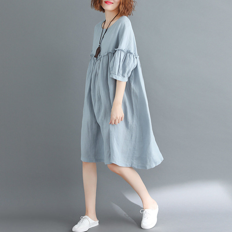 ゆったりとしたシルエットが心地よいワンピースです。 袖口にあしらわれたボリューム感のあるフリルが愛らしく、腕周りを華やかに演出します。 ハイウエストの切替デザインがスタイルアップ効果を生み出し、リラックス感がありながらも上品な印象に。 膝丈の程よい長さで、カジュアルからパーティードレスとしてまで幅広く活躍します。 自然な落ち感のある素材で着心地も抜群の一枚です。