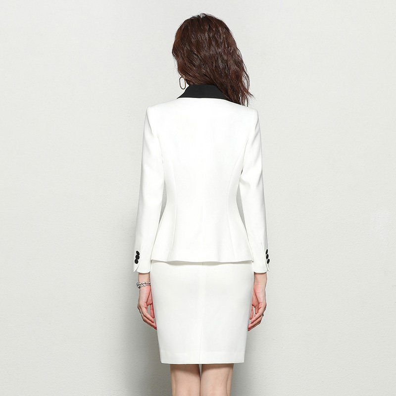 エレガントな配色襟デザインが目を引くパーティードレス向けのセットアップです。