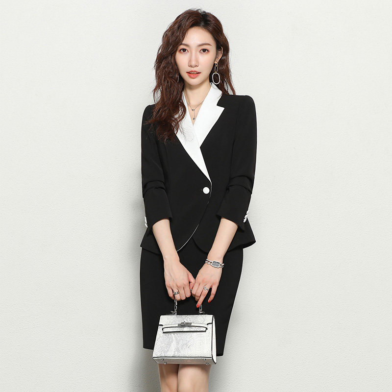 ペプラムシルエットのジャケットが女性らしい華やかさを演出し、タイトスカートがすっきりとした美しいラインを作ります。