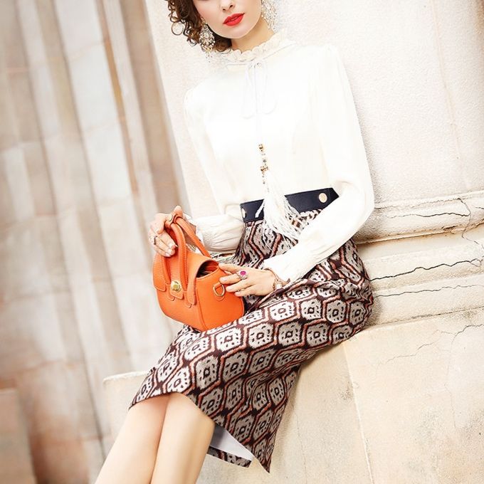 華やかなフリルネックが特徴的なブラウスと、洗練された幾何学模様のタイトスカートを組み合わせたパーティードレスのセットアップです。