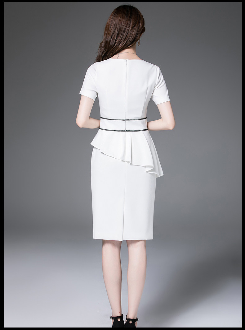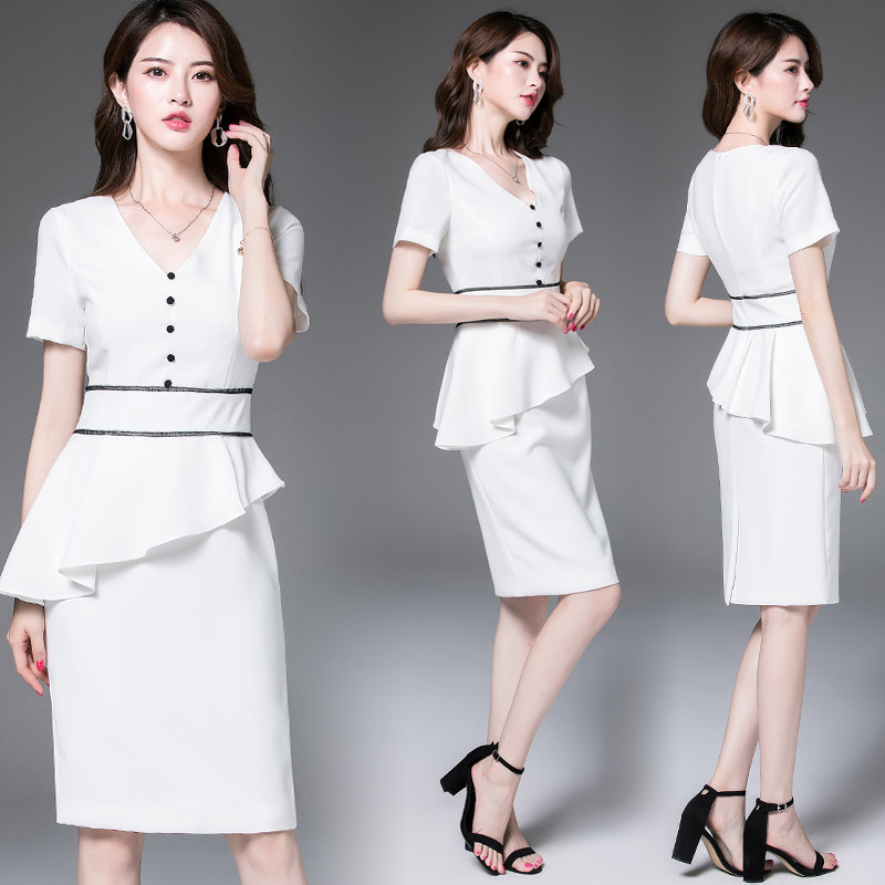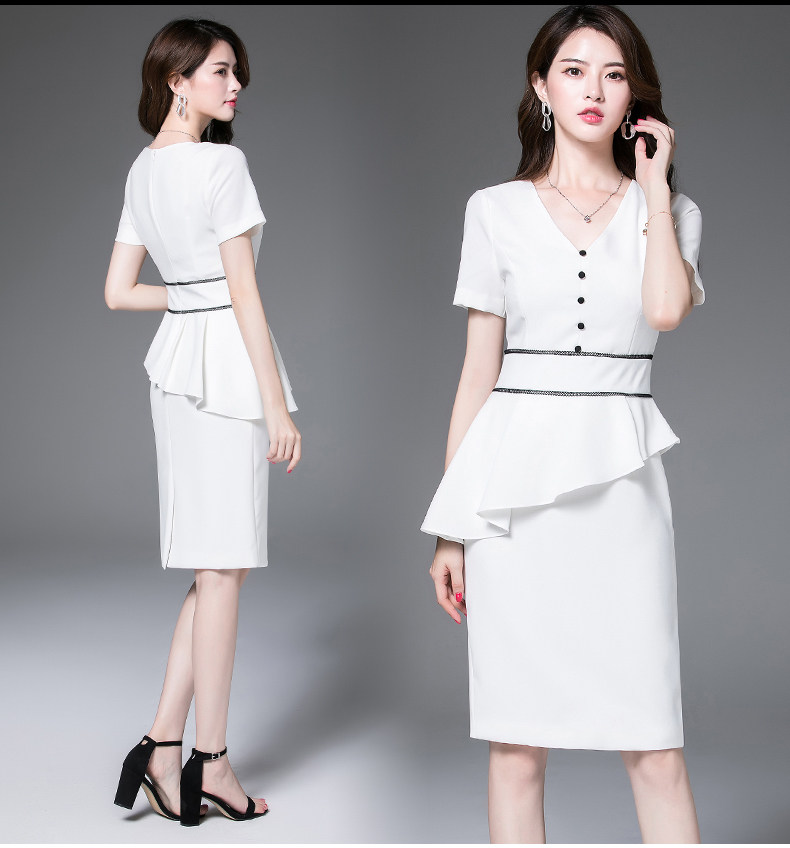 サイドの立体的なフリルが女性らしいシルエットを作り出し、膝丈のタイトスカートがすっきりとした着こなしを実現します。
