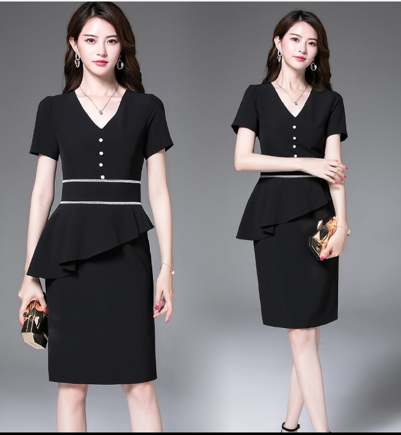 ブイネックと半袖の組み合わせが上品な印象を演出し、フロントのボタンとウエストの細身のラインがアクセントになっています。