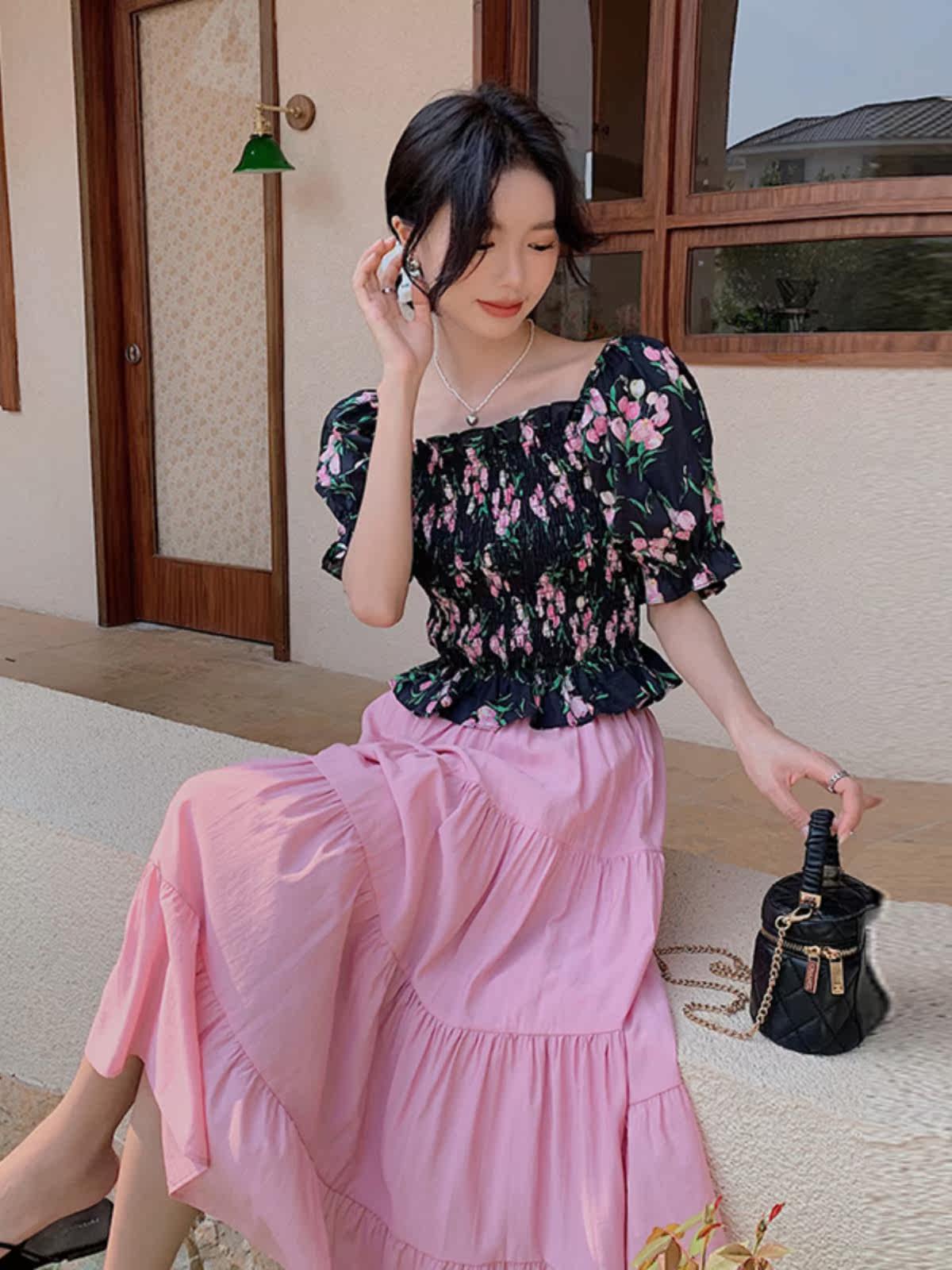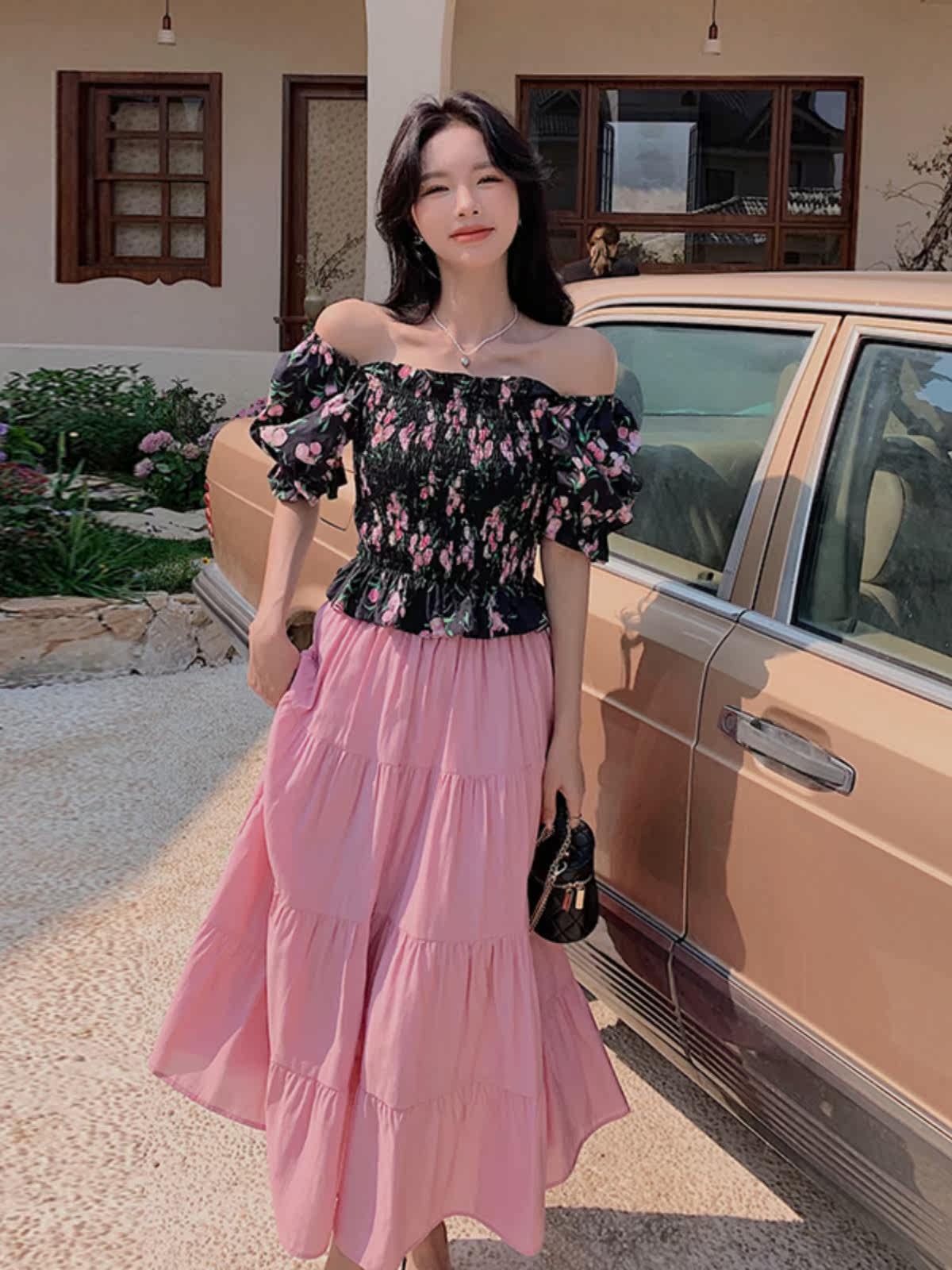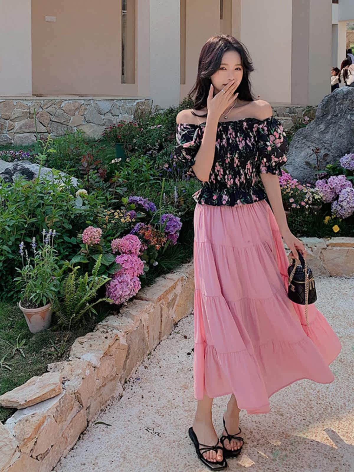華やかな花柄のオフショルダーブラウスとティアードスカートを組み合わせたパーティードレスのセットアップです。