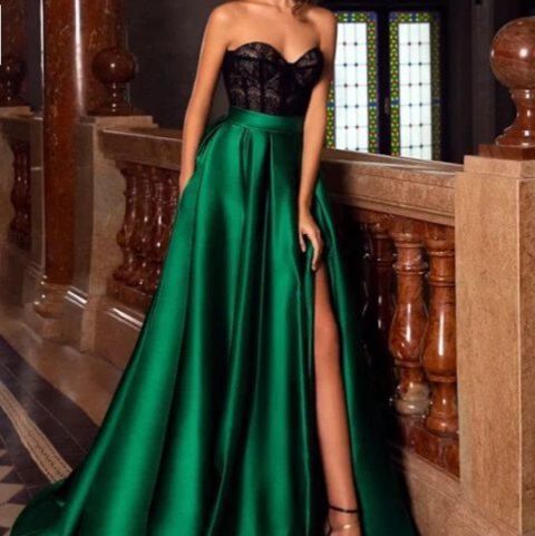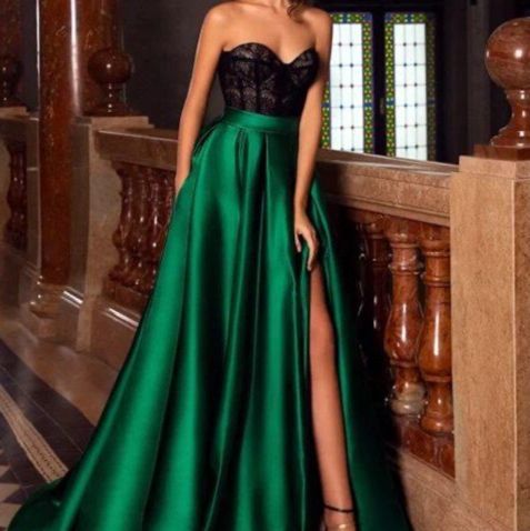 華やかなパーティーシーンにぴったりのワンピースです。 胸元のレース素材とサテン生地のスカート部分が美しいコントラストを生み出し、エレガントな雰囲気を演出します。 ベアトップデザインでデコルテラインを美しく見せ、ロング丈のスカートが上品な印象を与えます。 サイドスリット入りで歩きやすく、結婚式やパーティーなどのカジュアルドレスとして活躍する一着です。