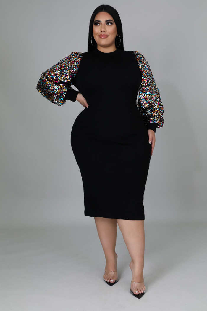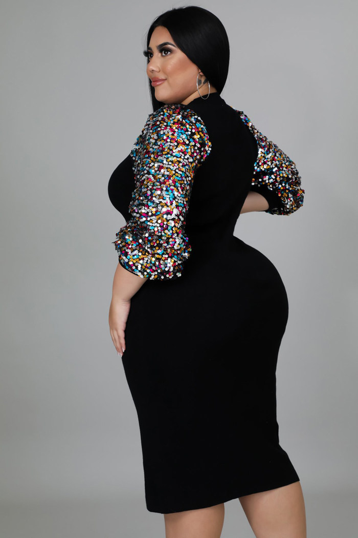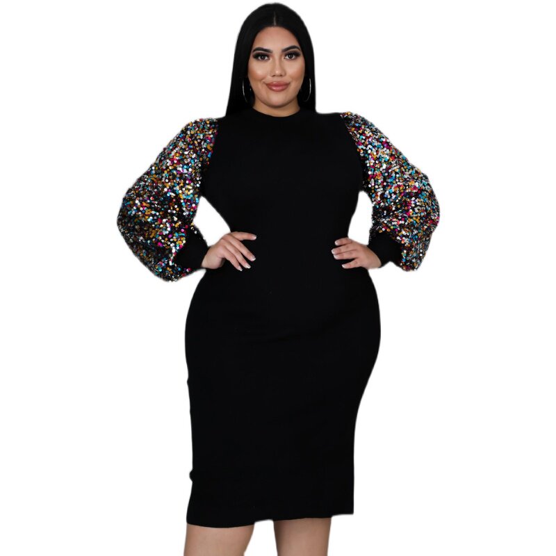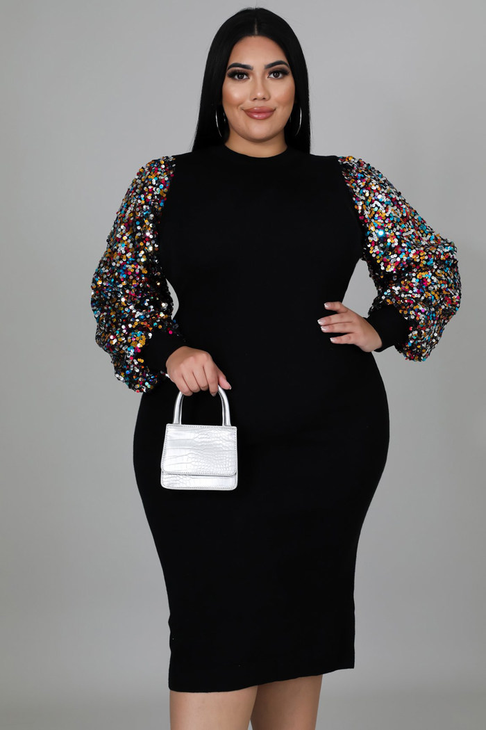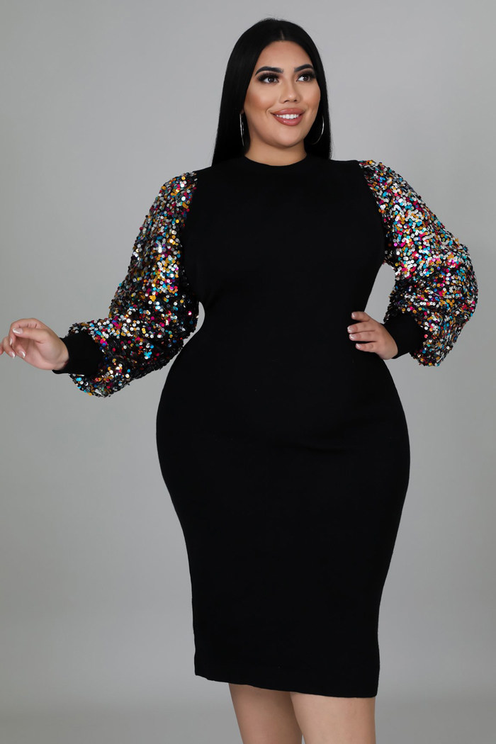 華やかなスパンコールをあしらった袖が目を引くカジュアルドレスです。