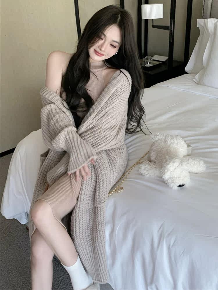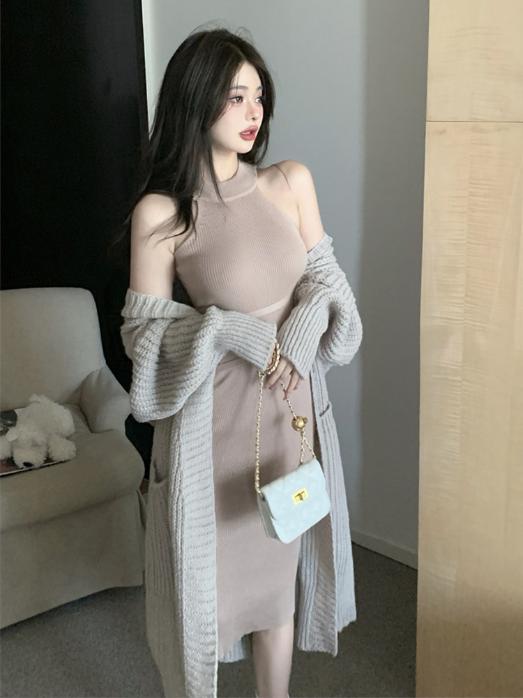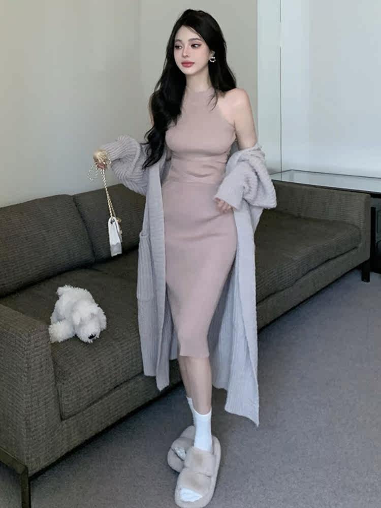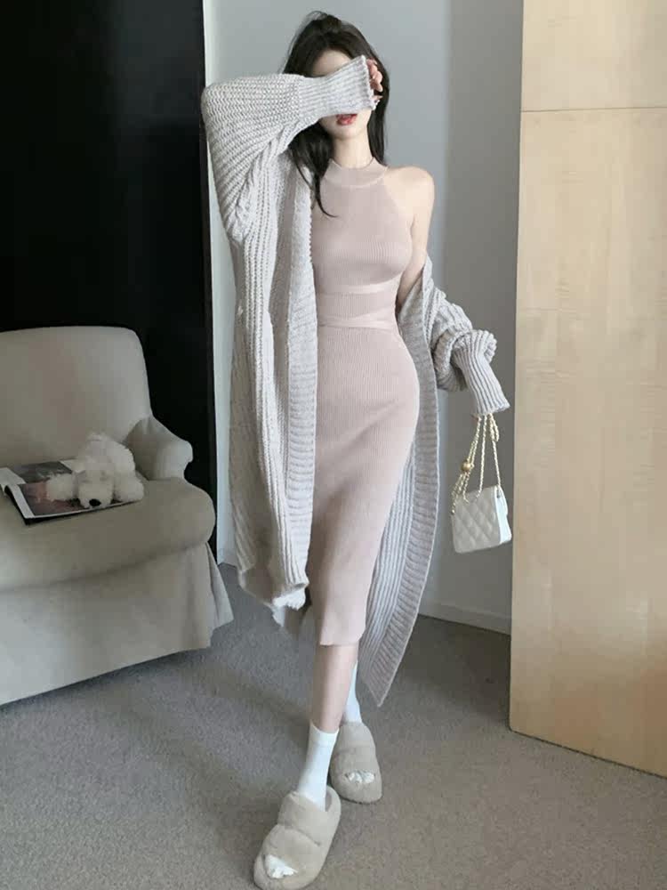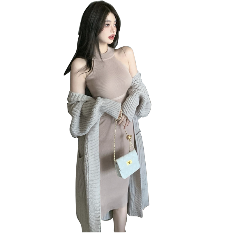 体のラインを美しく見せるノースリーブニットのワンピースとロング丈カーディガンの2点セットです。