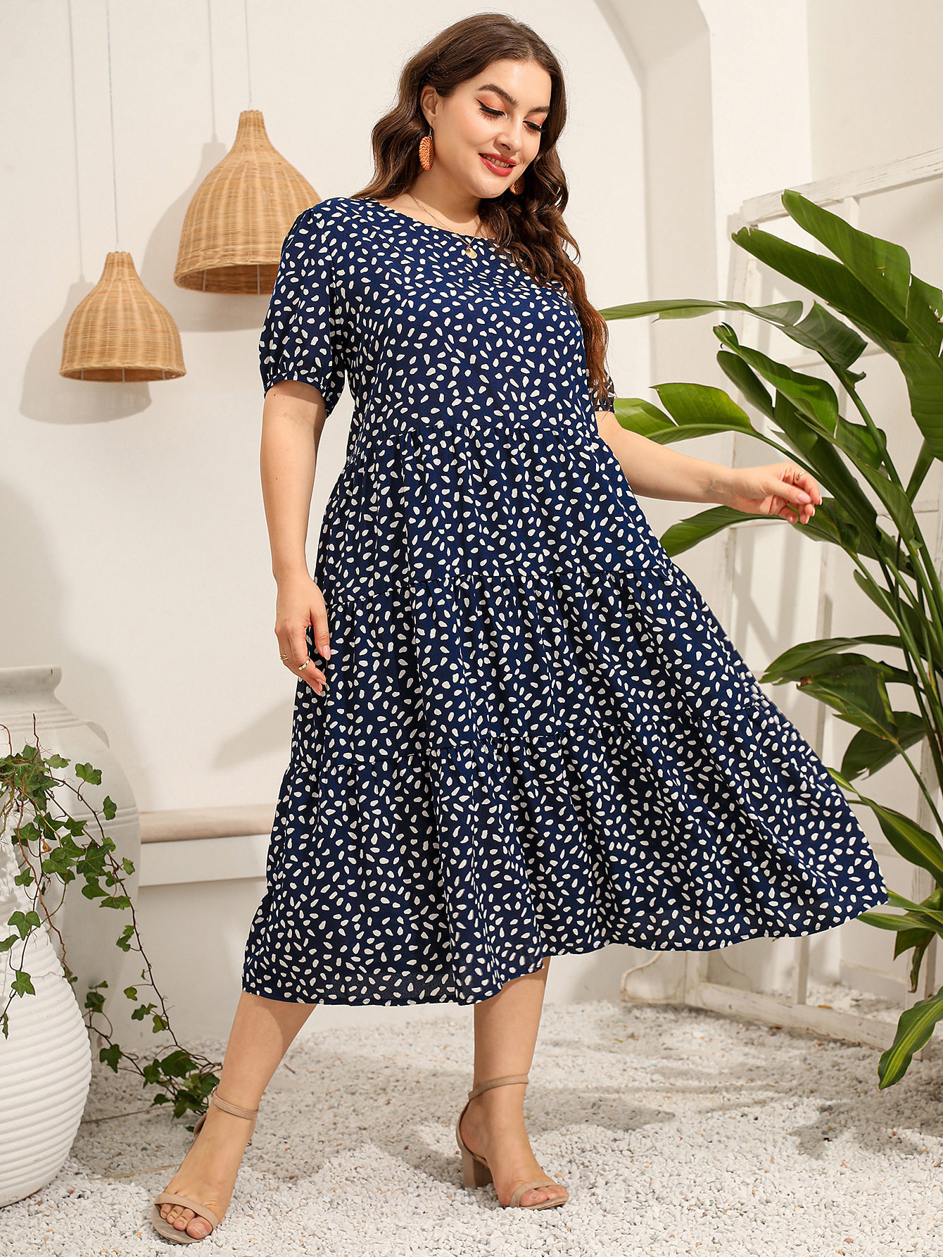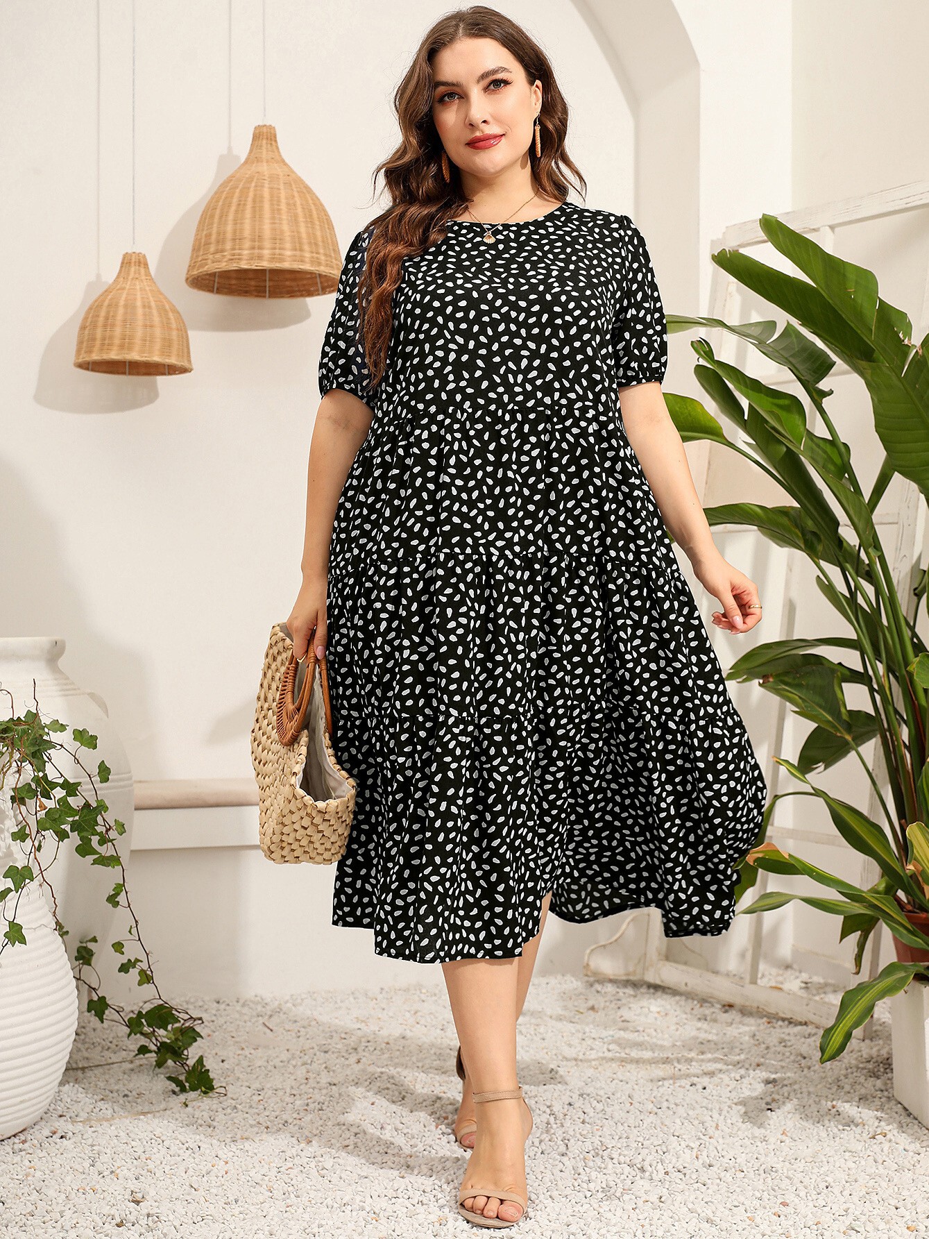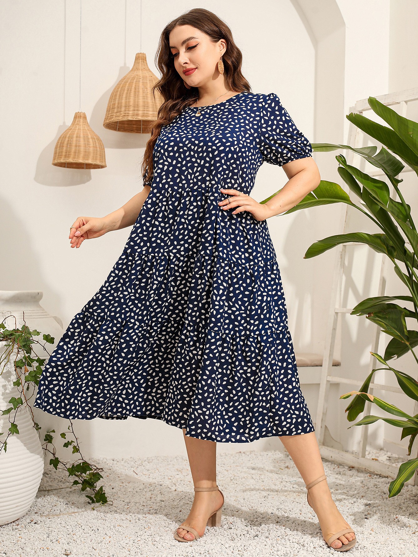 ふんわりとしたパフスリーブが女性らしさを演出し、ティアードデザインのスカートが軽やかに揺れて優雅な印象を与えます。