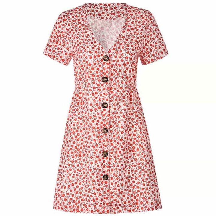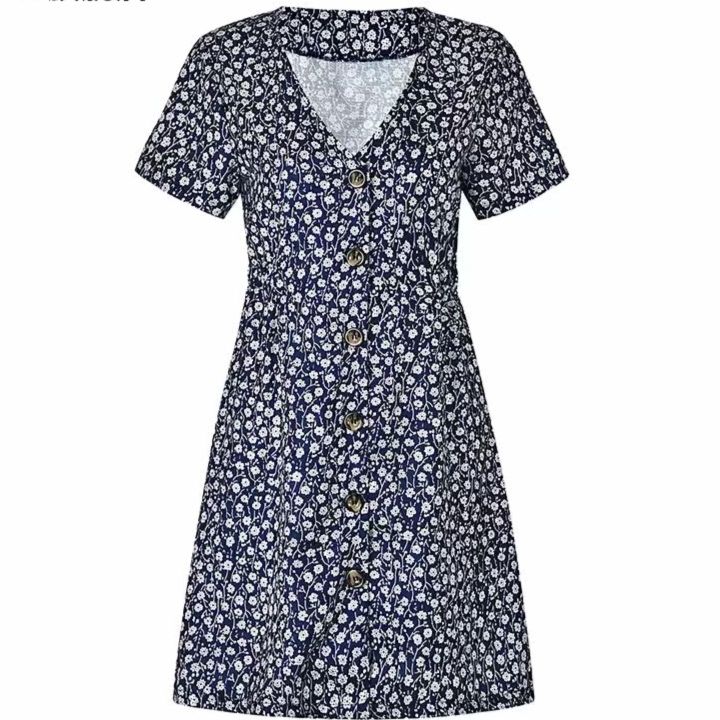 可愛らしい小花柄が魅力的なカジュアルドレスのワンピースです。 ブイネックデザインと前ボタン開きで着脱も簡単、程よい肌見せが女性らしさを引き立てます。 半袖とミニ丈で軽やかな印象を与え、夏のお出かけやリゾートシーンにぴったりです。 ウエスト部分は絞られたシルエットでスタイルアップ効果も期待できます。 一枚でおしゃれが完成する使い勝手の良いアイテムです。
