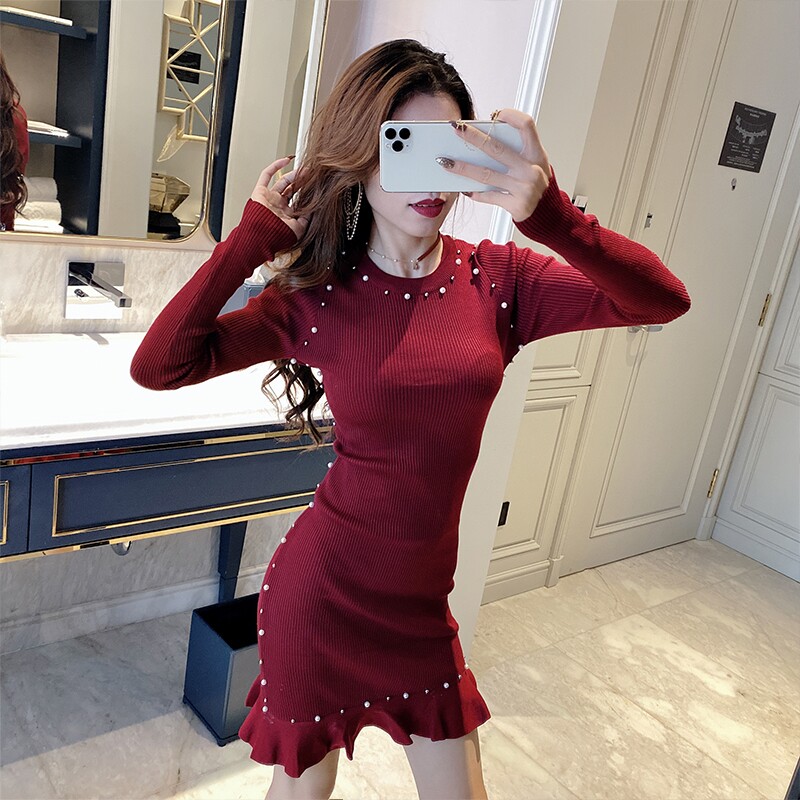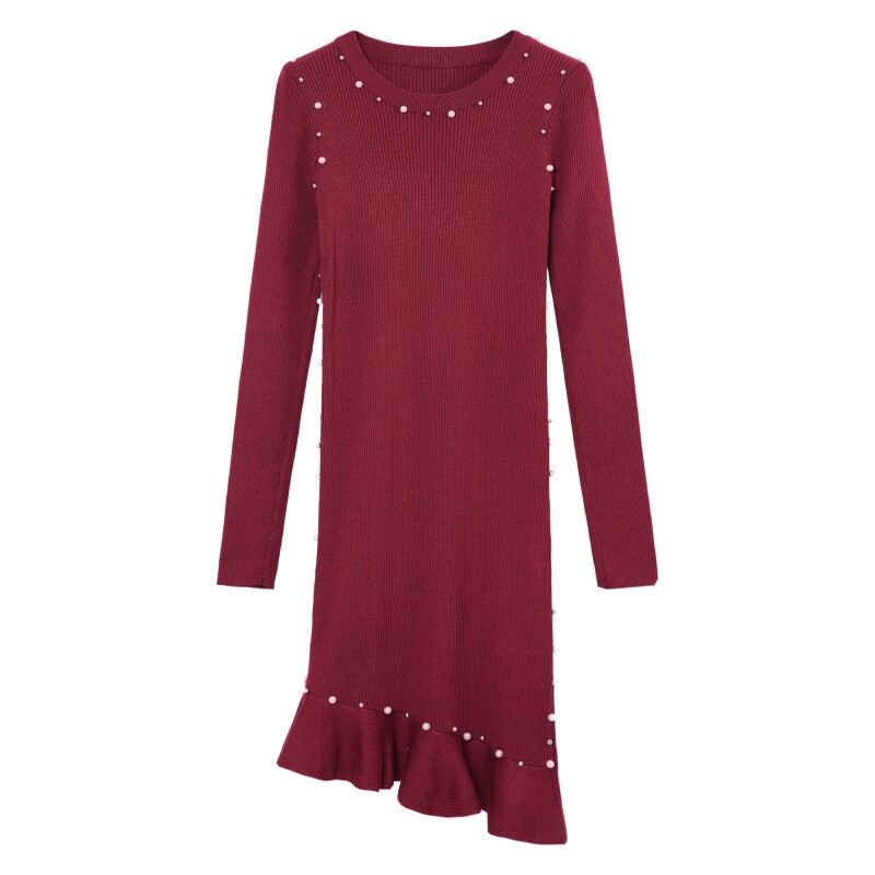 上品なパール装飾が襟元と裾に施された長袖ニットワンピースです。