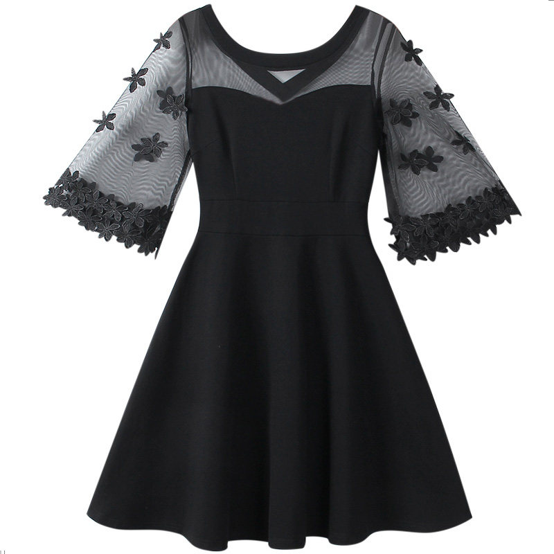 透け感のある袖に施された立体的な花刺繍が女性らしさを演出し、身頃はすっきりとしたシルエットで体型をきれいにカバーします。