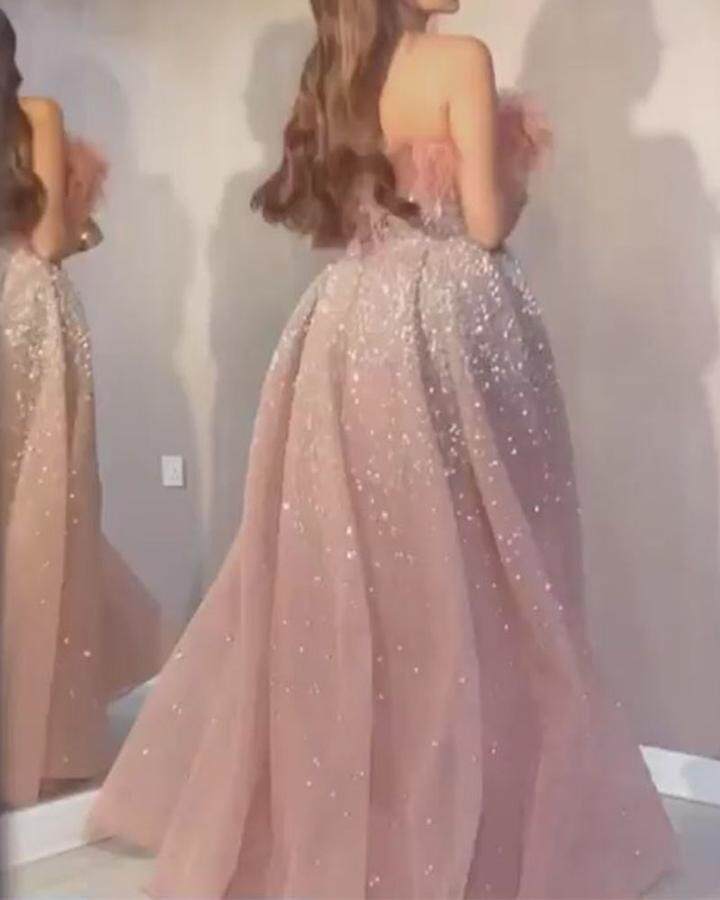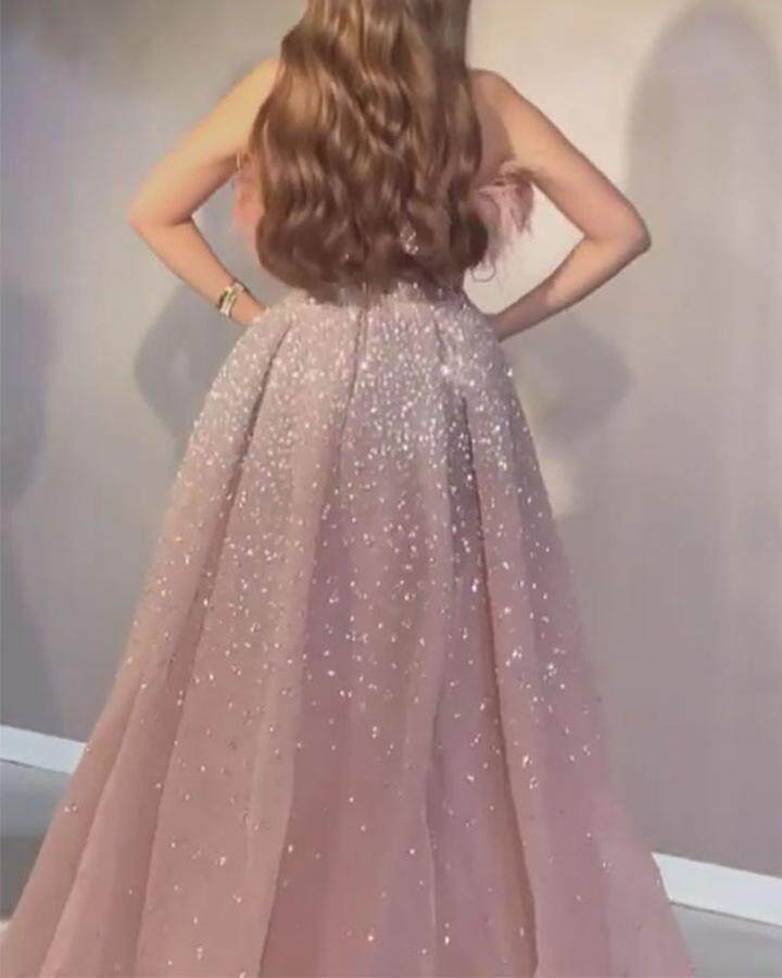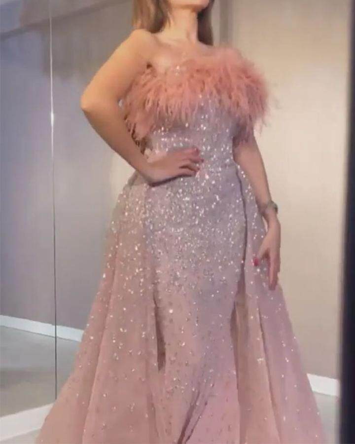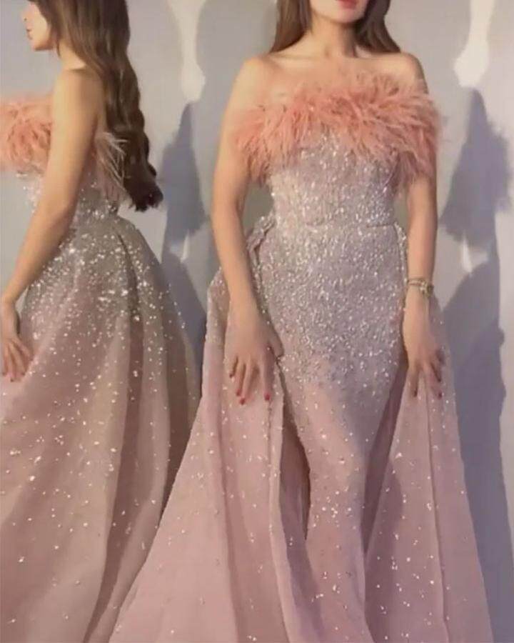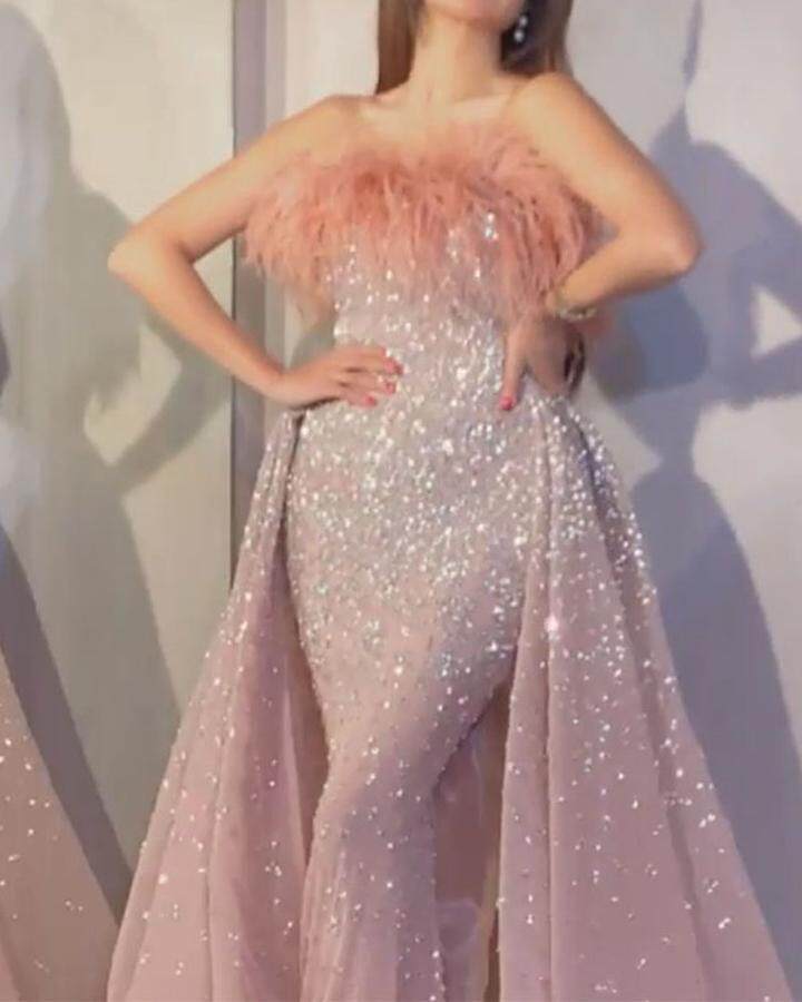 胸元のふわふわとしたフェザー装飾が女性らしさを演出し、全体に散りばめられたスパンコールが上品な輝きを放ちます。