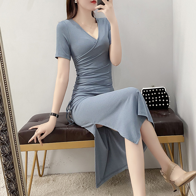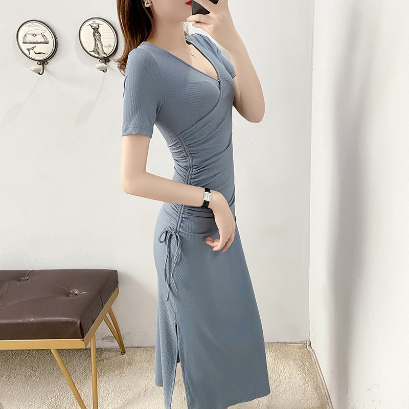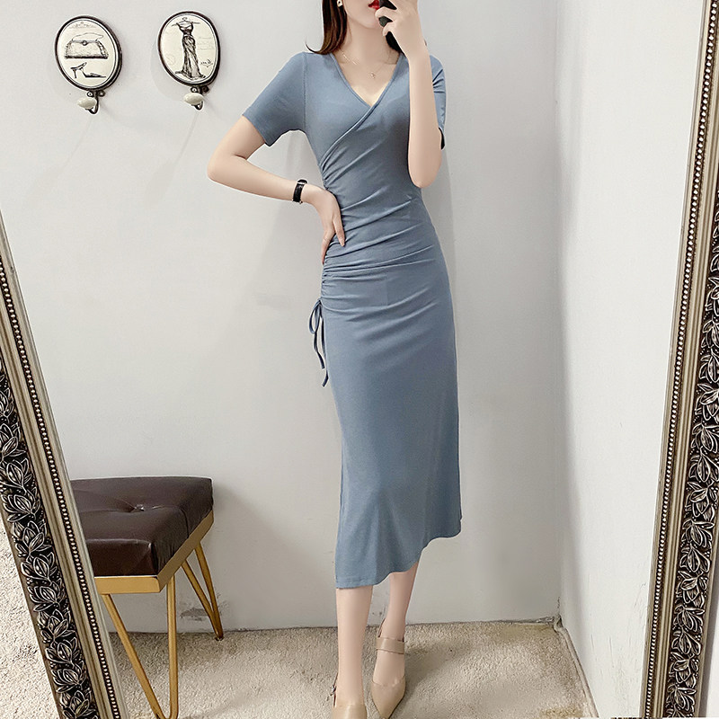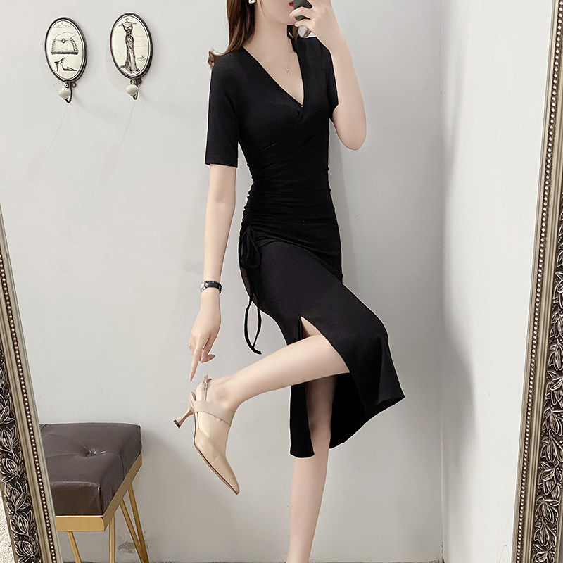 女性らしいブイネックと体のラインを美しく見せるサイドドレープが特徴のカジュアルドレスです。 柔らかな素材が体にフィットし、ウエストの立体的なギャザーが細見え効果を発揮します。 サイドのリボンディテールがアクセントになり、スタイリッシュな印象に仕上げます。 膝下丈のスリット入りスカートで動きやすさも抜群です。 デイリーから特別な日まで幅広く活躍するワンピースです。