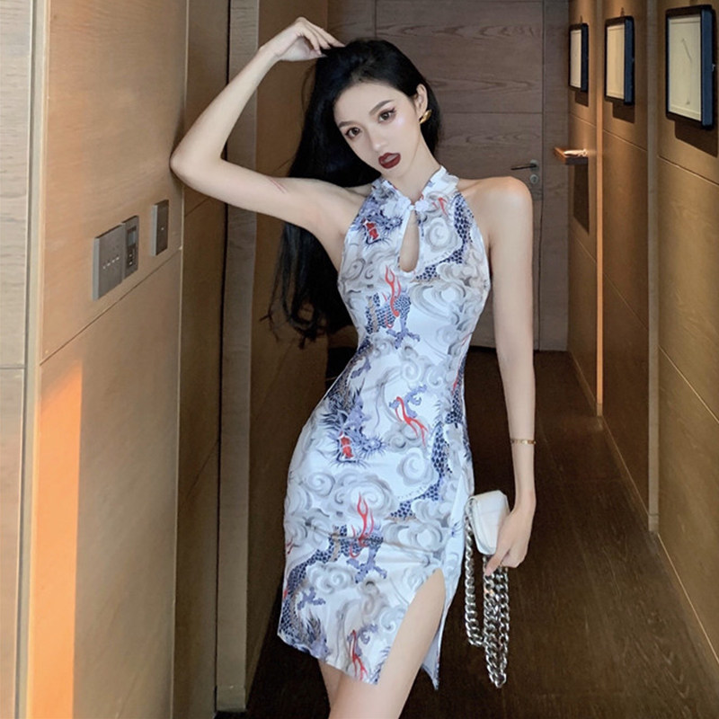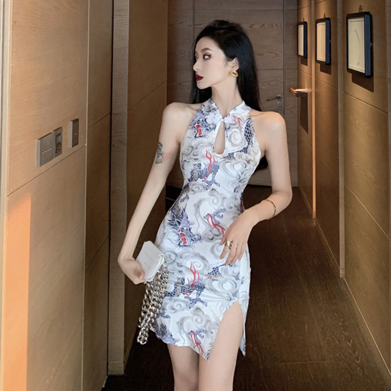 龍と雲の華やかな柄が目を引くワンピースで、ホルターネックデザインが首元をすっきりと見せてくれます。