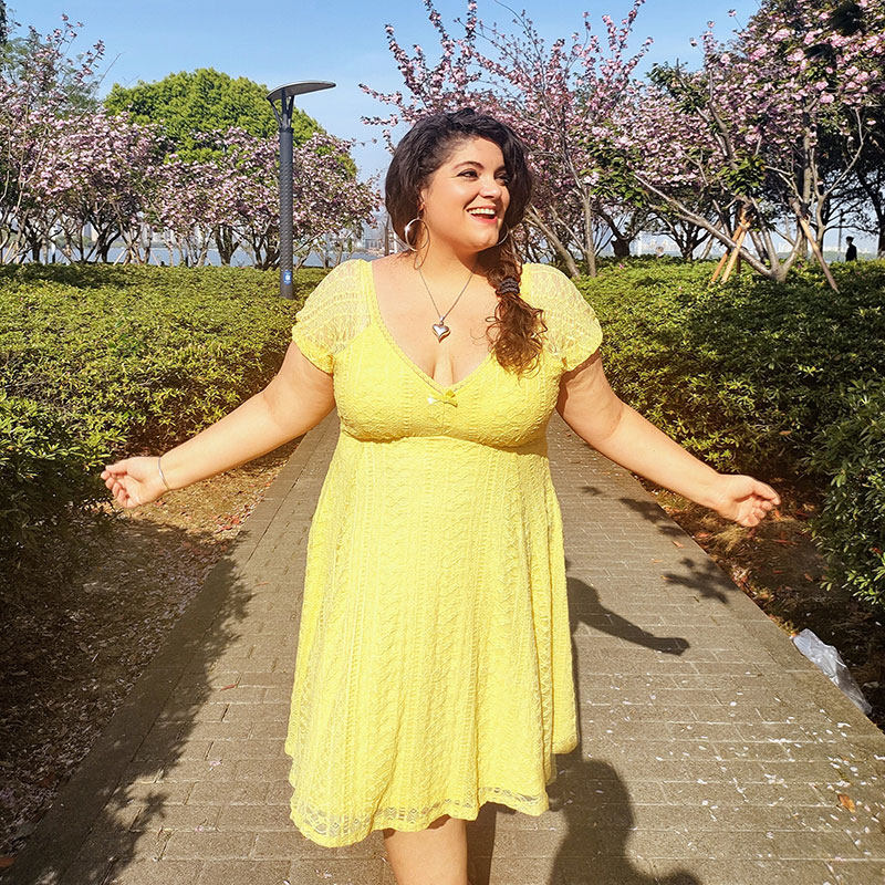 ふんわりと広がるフレアシルエットが動くたびに揺れて、女性らしさを引き立てるワンピースに仕上がりました。