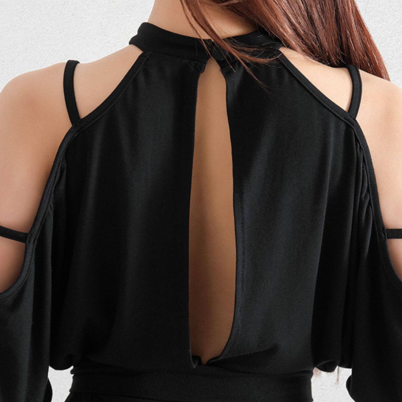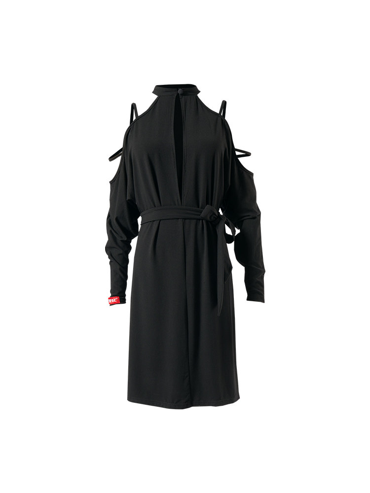 肩の部分が個性的に開いたデザインが魅力的なカジュアルドレスです。