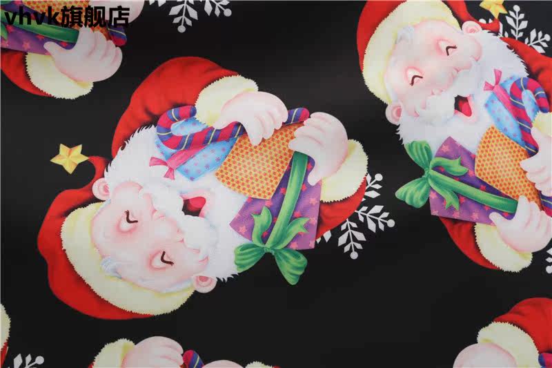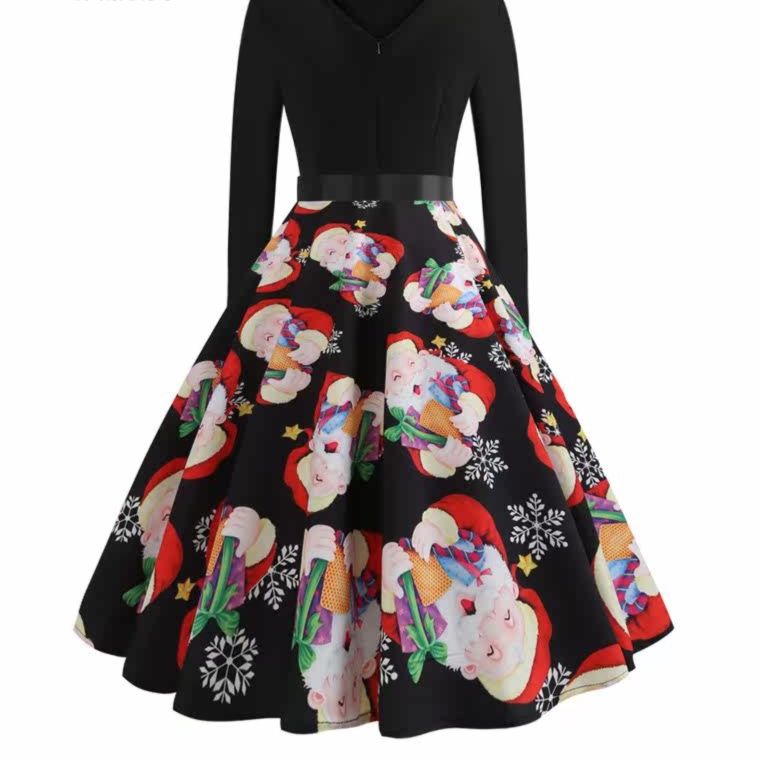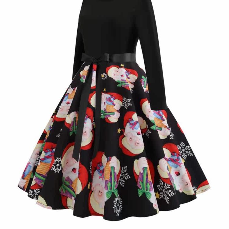 上品な無地の長袖トップスと、かわいい雪だるまやプレゼント、雪の結晶がデザインされたフレアスカートを組み合わせたワンピースです。