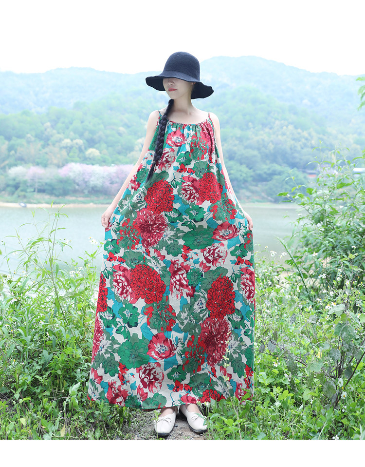 鮮やかな大輪の花々が全面に咲き誇る、存在感抜群のワンピースです。