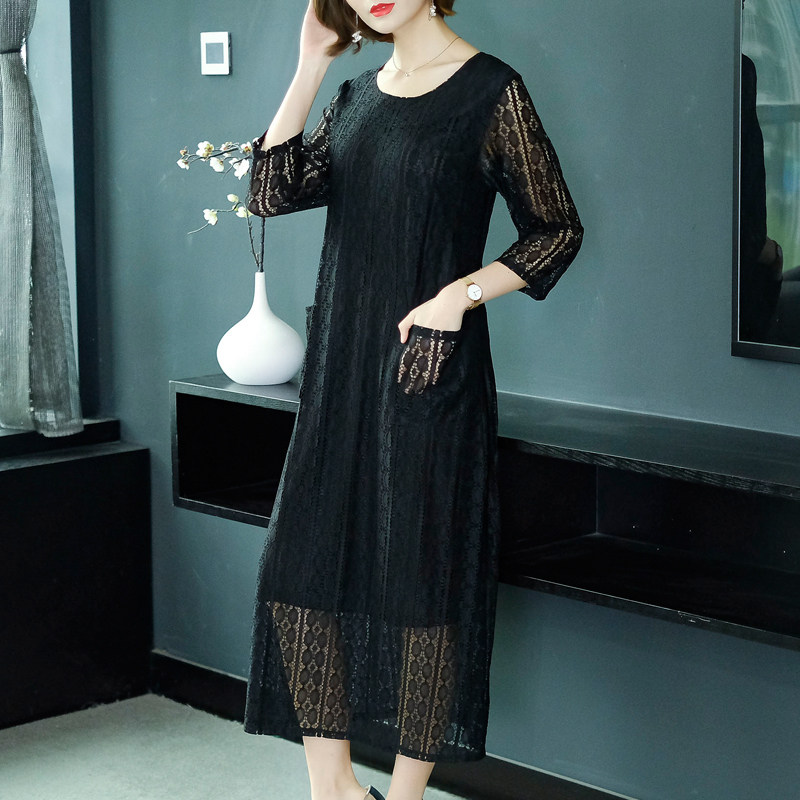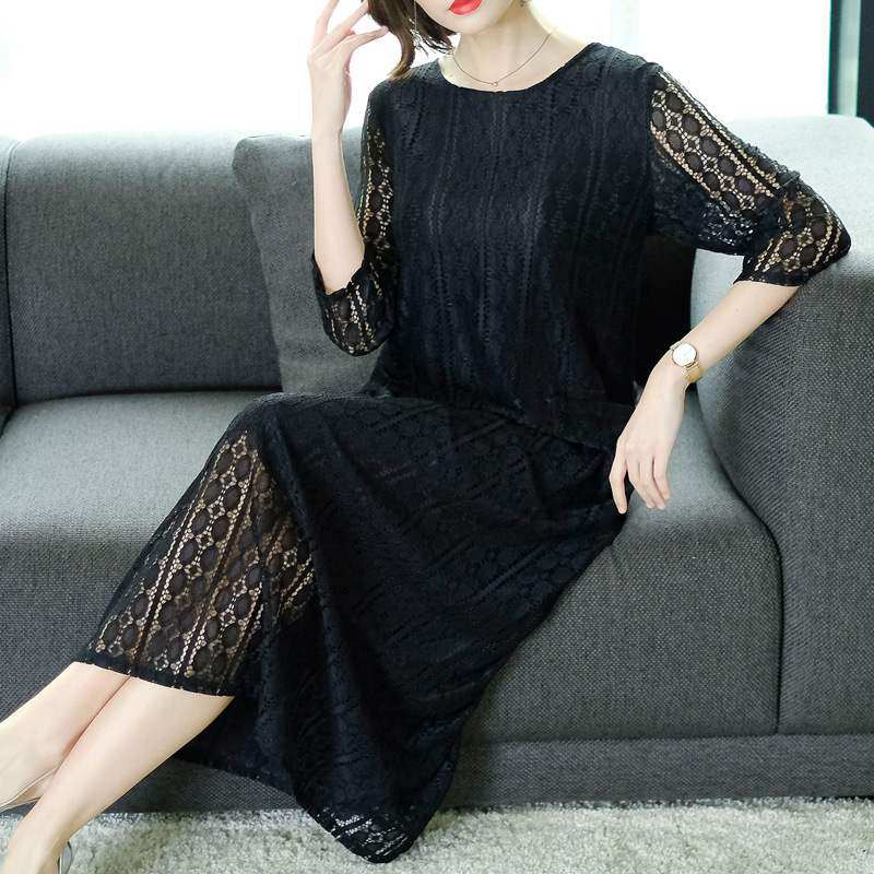 透け感のある袖と裾のレースが女性らしさを演出し、ミディ丈で落ち着いた雰囲気に仕上げました。