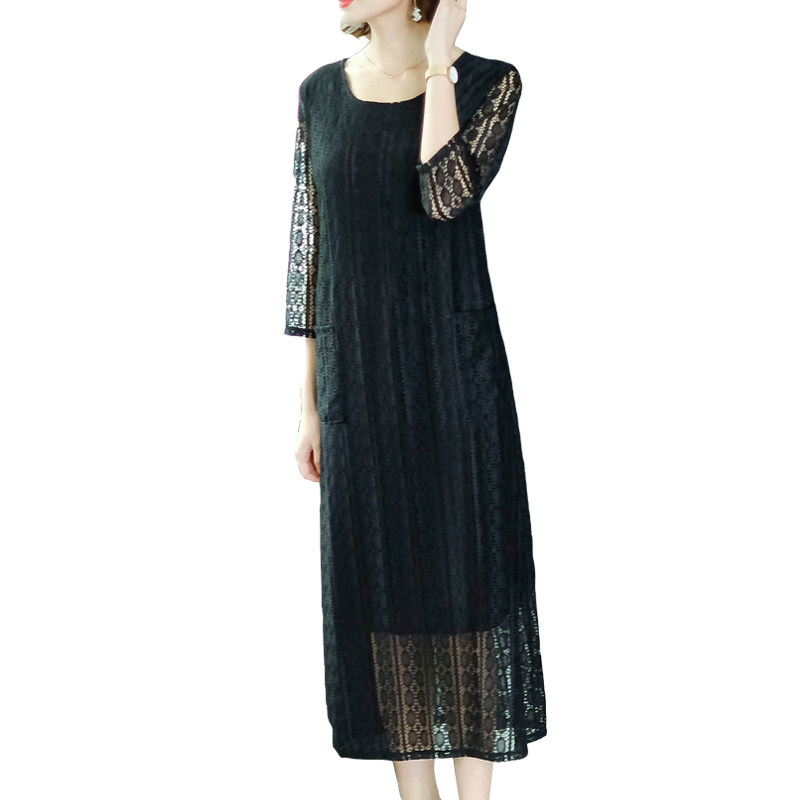 繊細な総レース素材が上品な印象を与えるパーティードレスです。 透け感のある袖と裾のレースが女性らしさを演出し、ミディ丈で落ち着いた雰囲気に仕上げました。 七分袖なので二の腕をカバーしながら軽やかな印象に。 両サイドのポケット付きで実用性も兼ね備えたワンピースです。 結婚式の二次会や食事会、発表会など幅広いシーンで活躍します。 一枚でエレガントに決まる大人のための上質なアイテムです。