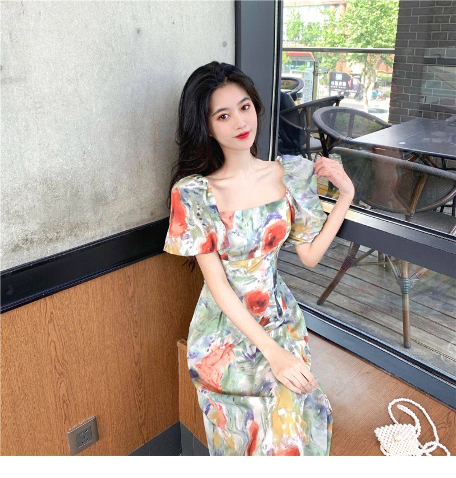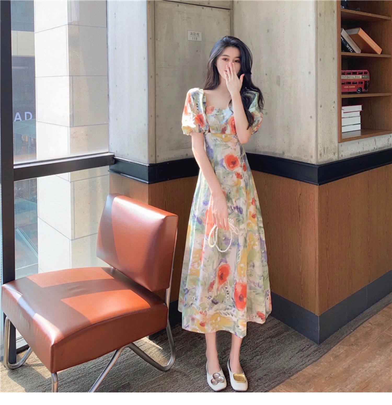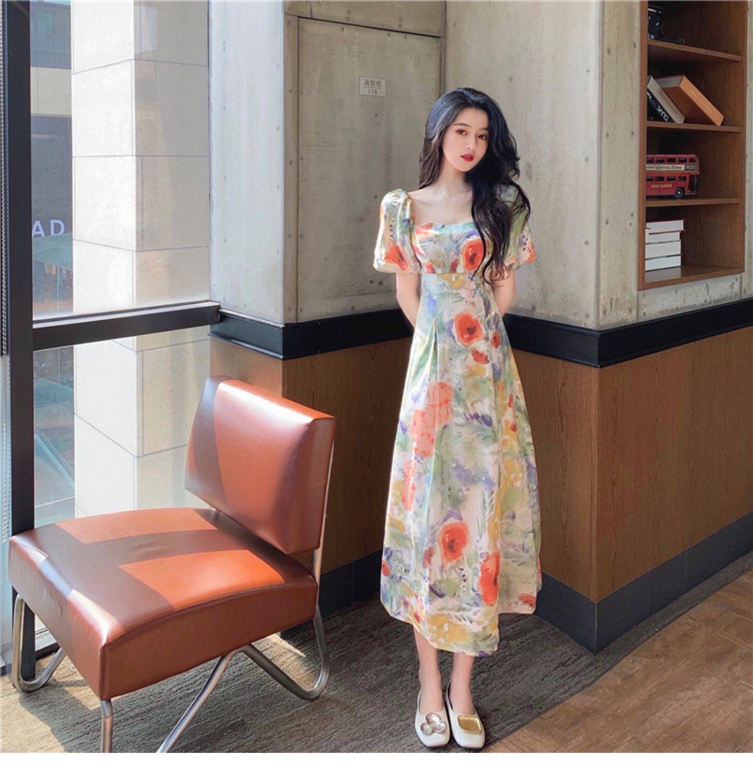 柔らかなパフスリーブとスクエアネックが女性らしさを引き立て、ロング丈のシルエットが上品な雰囲気を演出します。