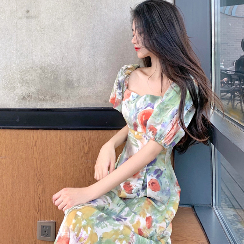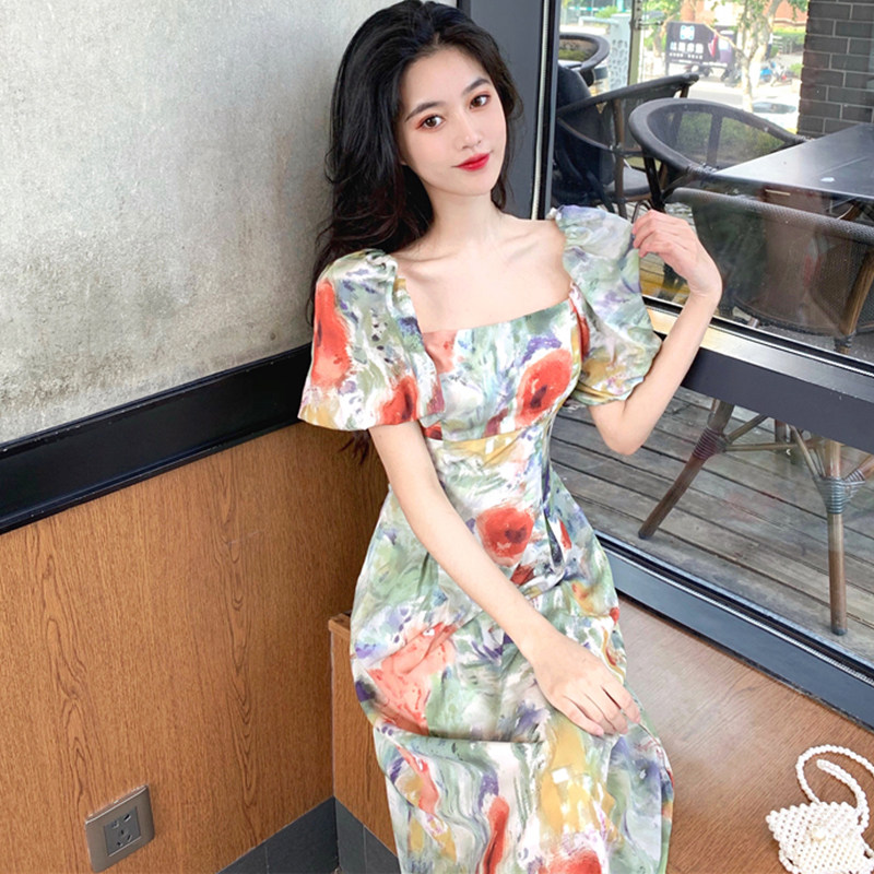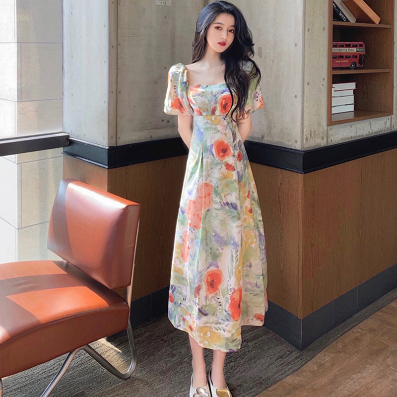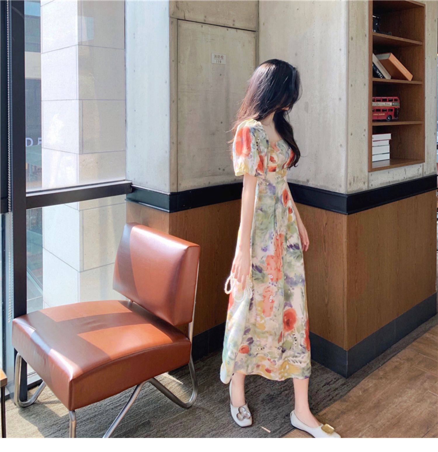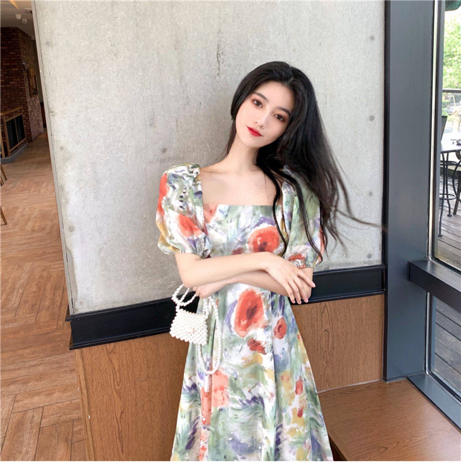 柔らかなパフスリーブとスクエアネックが女性らしさを引き立て、ロング丈のシルエットが上品な雰囲気を演出します。