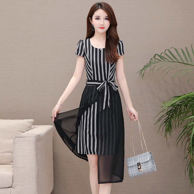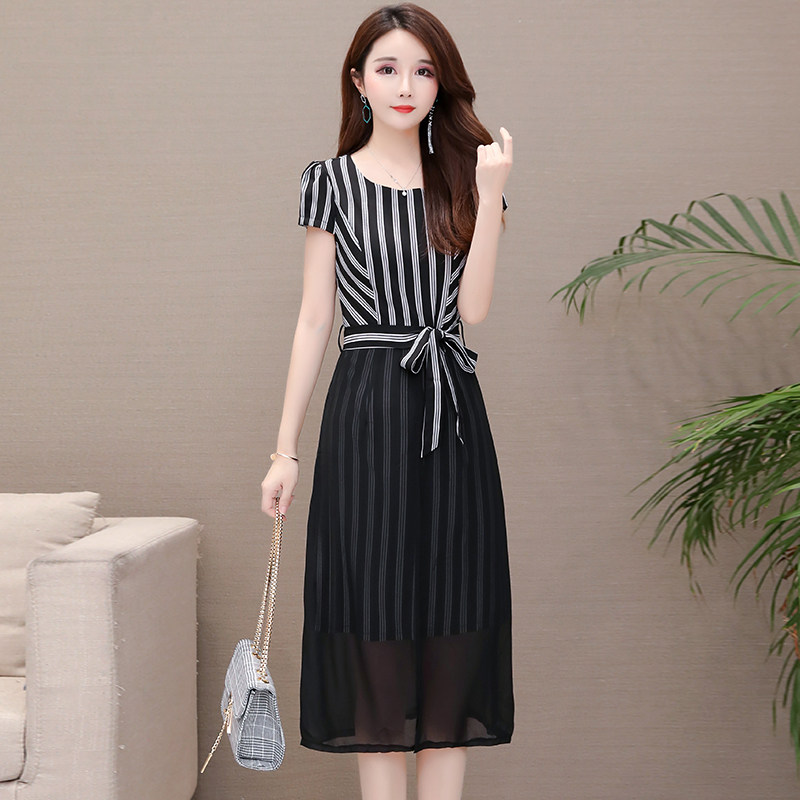 洗練された縦縞模様が目を引くパーティードレスです。